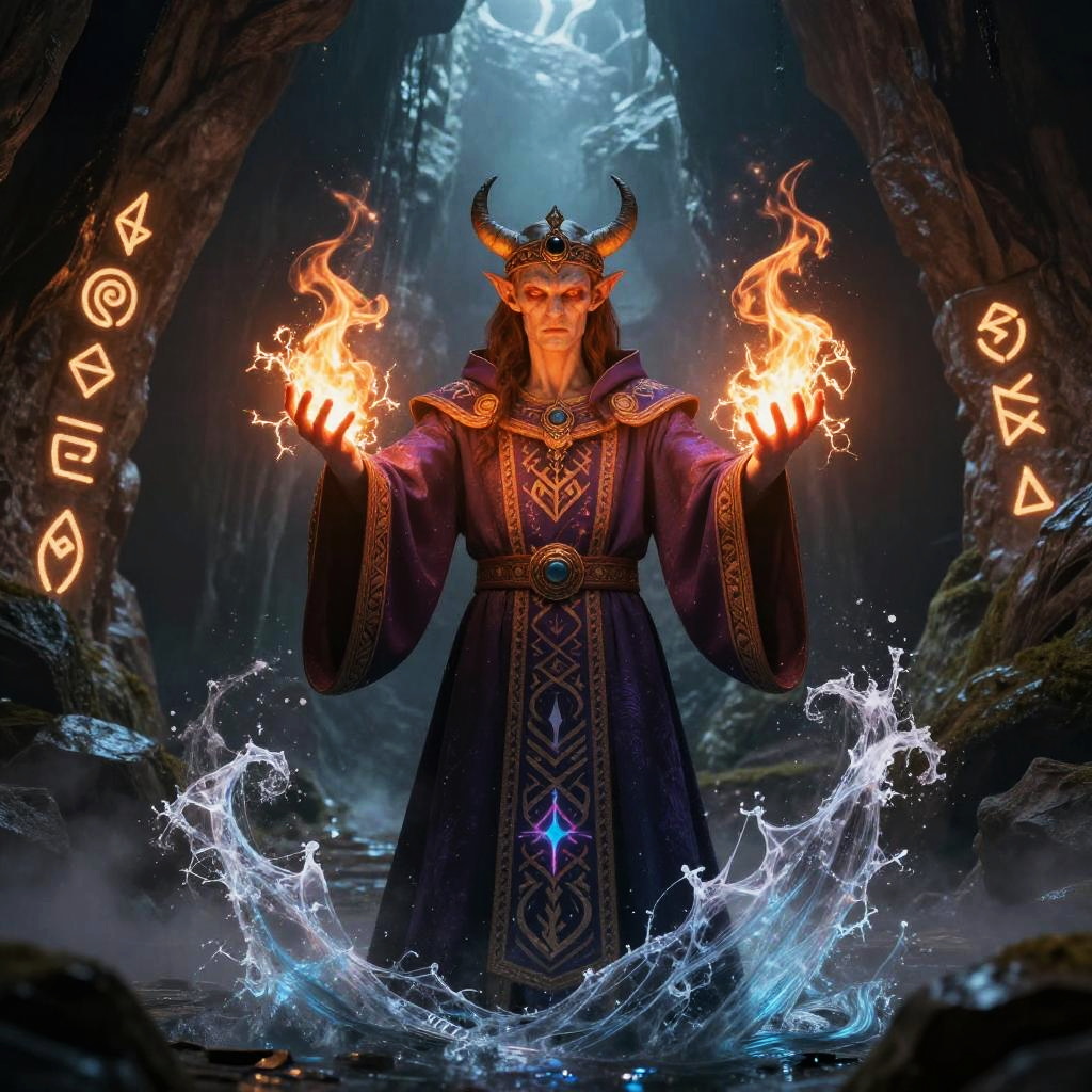 Genasi cleric casting a spell in a misty cavern, elemental energy crackling from their palms, swirling fire and water, adorned in ceremonial robes with elemental patterns, glowing runes on stone walls, atmospheric fantasy scene
