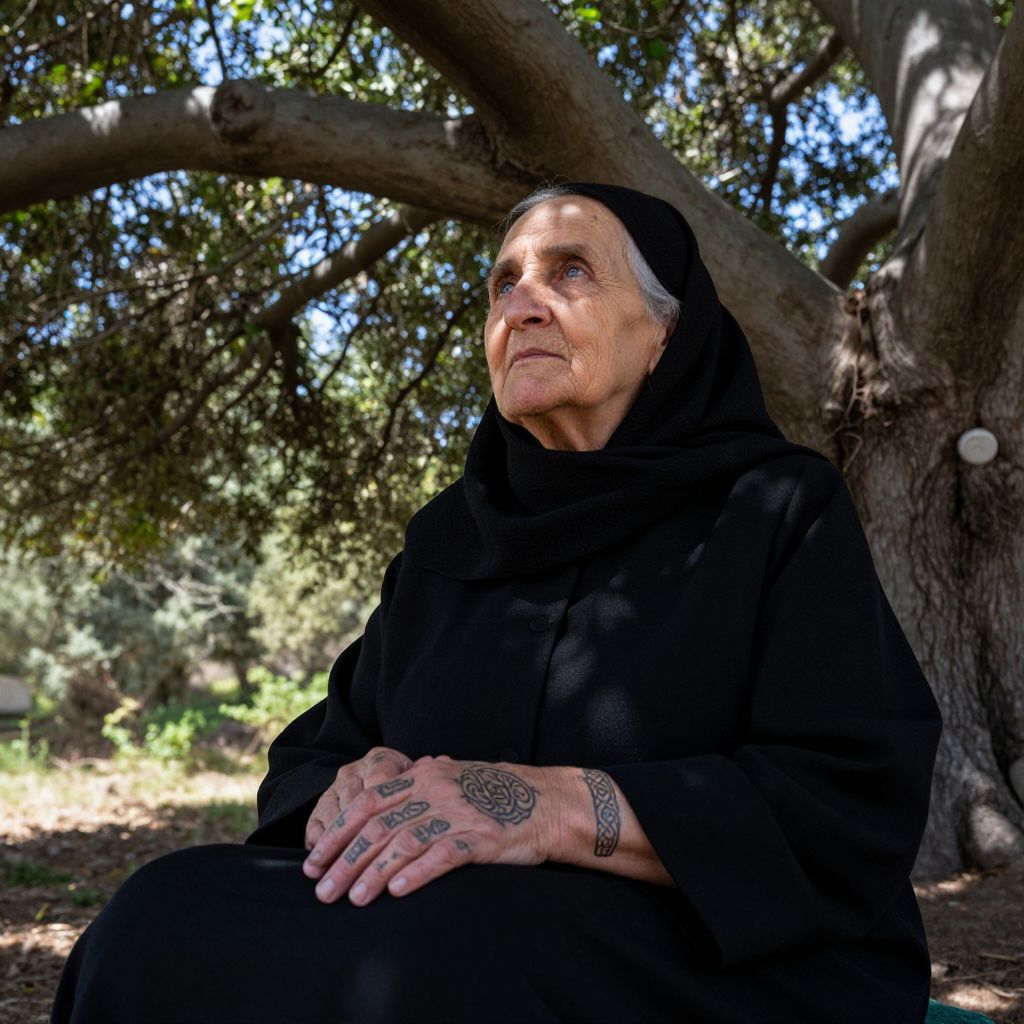 Photograph of an elderly woman with light skin and gray hair, wearing a black hooded robe, seated under a large tree with a thick trunk and sprawling branches. Her hands, resting on her lap, feature intricate tattoos on her right hand and a silver bracelet on her left. She gazes upward with a contemplative expression. Sunlight filters through the tree's leaves, casting dappled shadows on her face and robe. The background includes blurred greenery and a hint of a white structure. The overall atmosphere is serene and introspective.