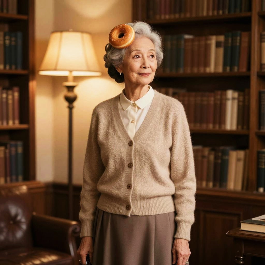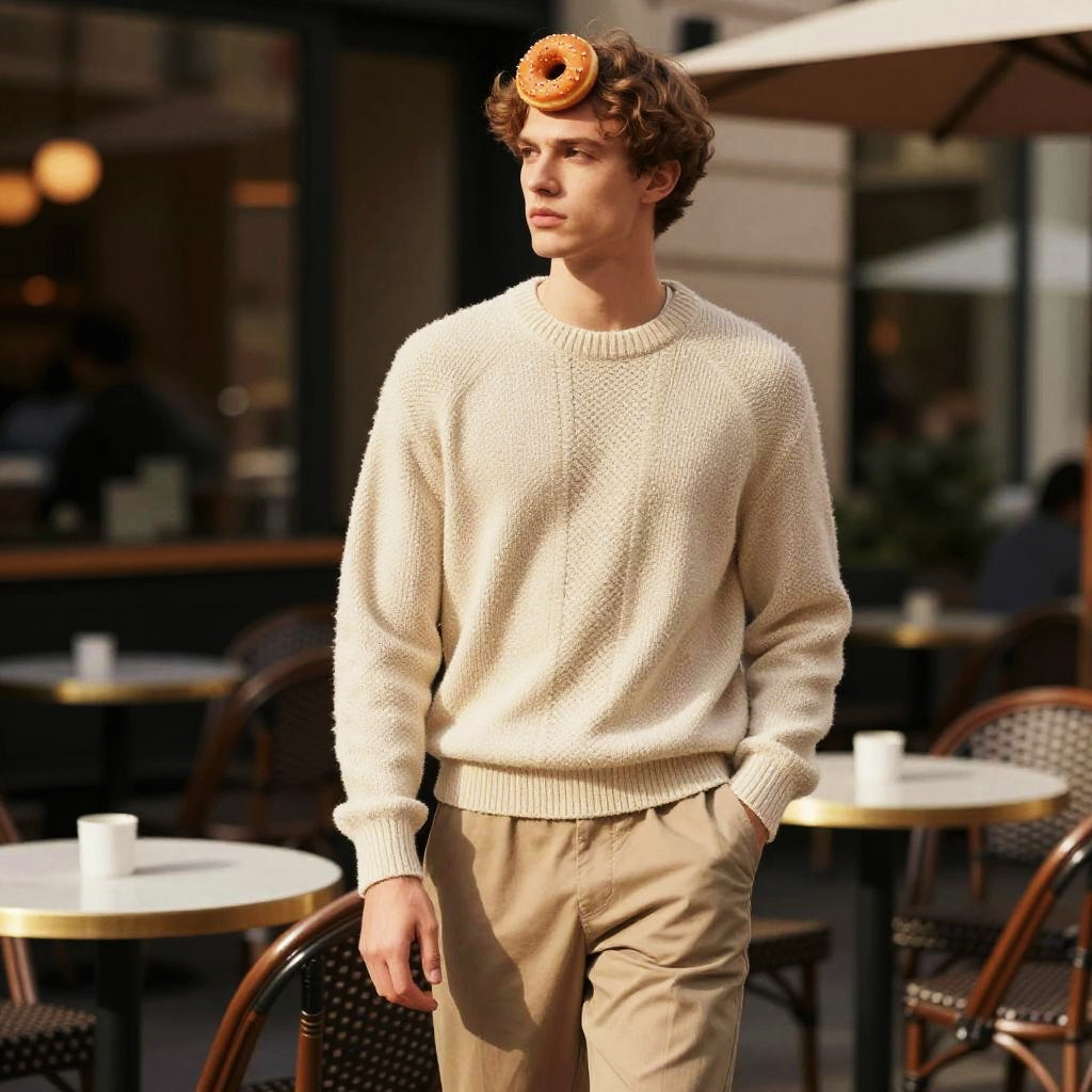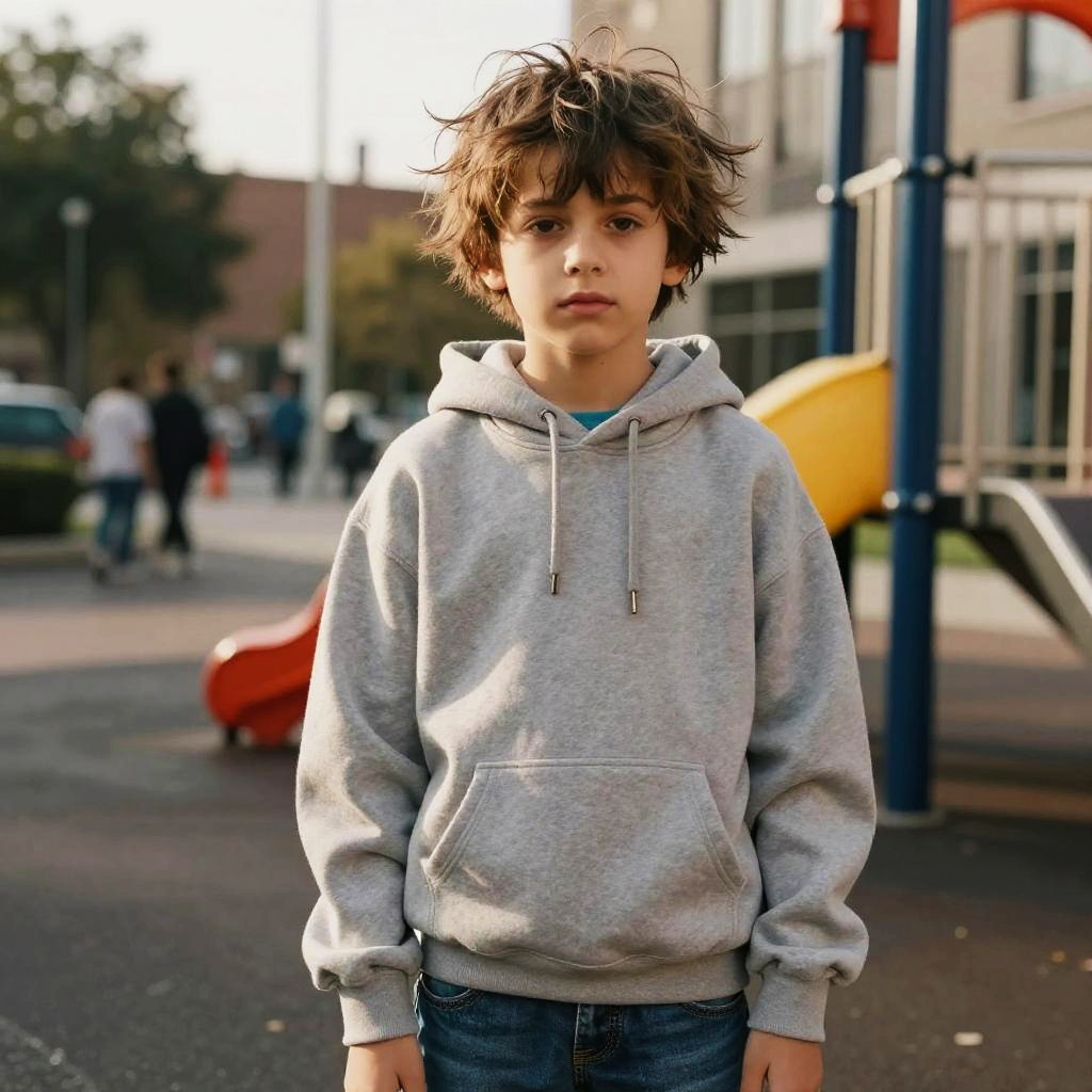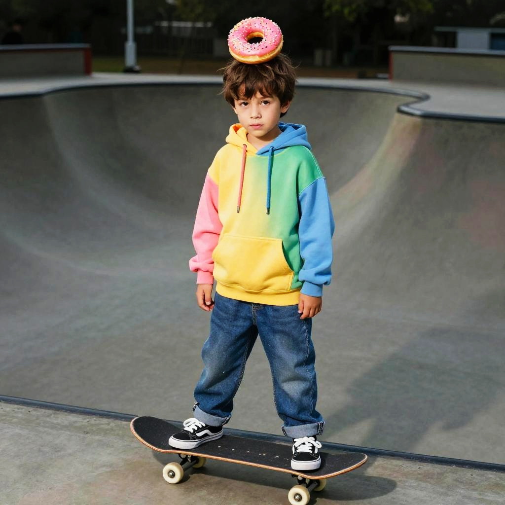 Doughnut Bun hairstyle on young boy, wearing colorful hoodie and jeans, in skate park, captured in fashion editorial style with dramatic spotlight.