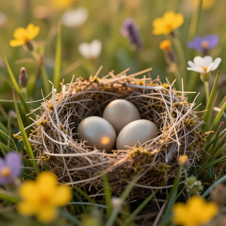 Nests made of soft moss and delicate grasses nestled among blooming wildflowers in a vibrant meadow, close-up view showing bird eggs with subtle reflections, warm golden hour lighting, ultra-detailed macro photography style