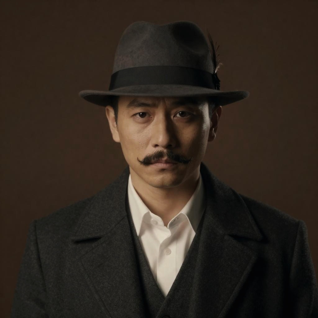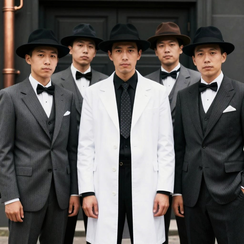 Photograph of six men in vintage, pinstriped suits and black hats. Central man in white coat, black shirt, polka-dot tie, and confident pose. Five men in gray and black suits with bow ties, one with brown hat. Background: dark building, copper pipes. Men's expressions: neutral to slightly amused. Front-left man holds a bow tie. Front-right man has a pocket square. All stand closely together.
