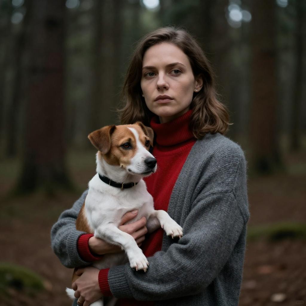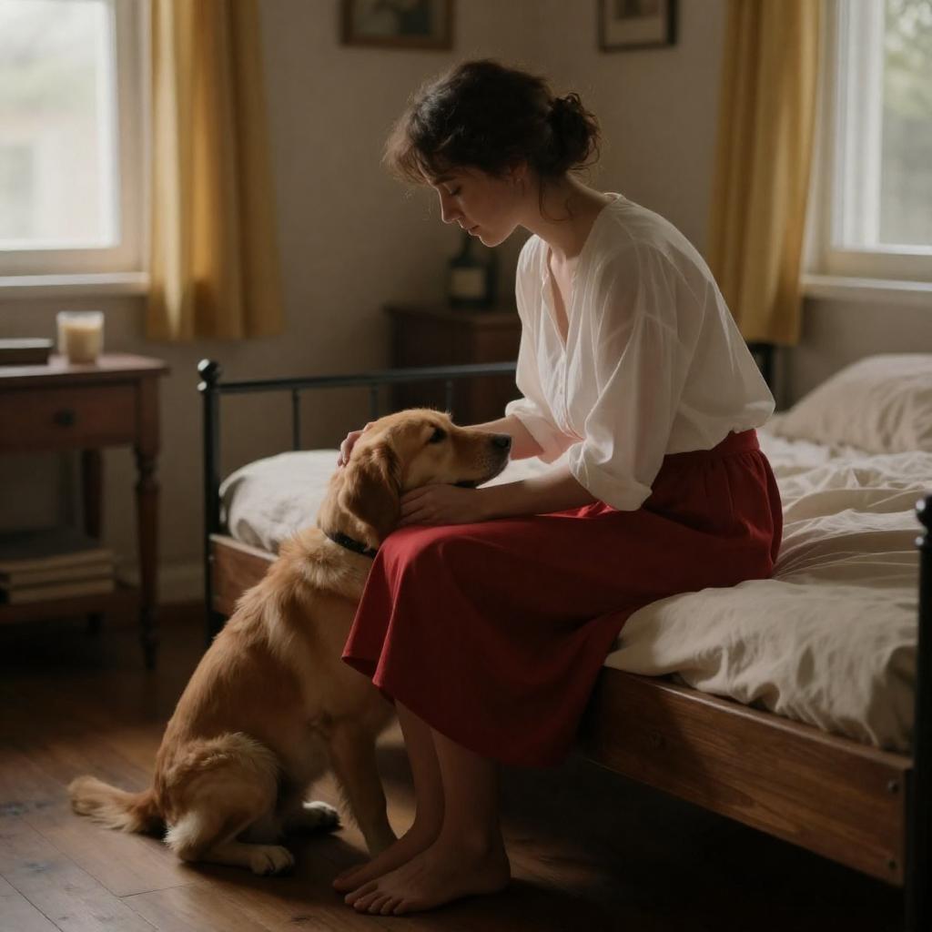 Young woman with short dreadlocks with medium-sized brindle pit bull mix with a glossy, slightly wind-tossed coat, warm soulful eyes, a faded floral fabric collar, sitting close and resting its head protectively near her belly in sunset marsh boardwalk winding through tall golden reeds and wildflowers, reflective channels of water, distant heron silhouette, soft golden mist and warm backlight, warm natural light, candid companionship, subtle wind in hair and fur, lush environmental details, photorealistic, cinematic composition, shallow depth of field, creamy bokeh, high resolution, refined color grading, soft lens flare, gentle vignette, lifelike skin texture, detailed fur, ambient haze, balanced contrast, natural color palette