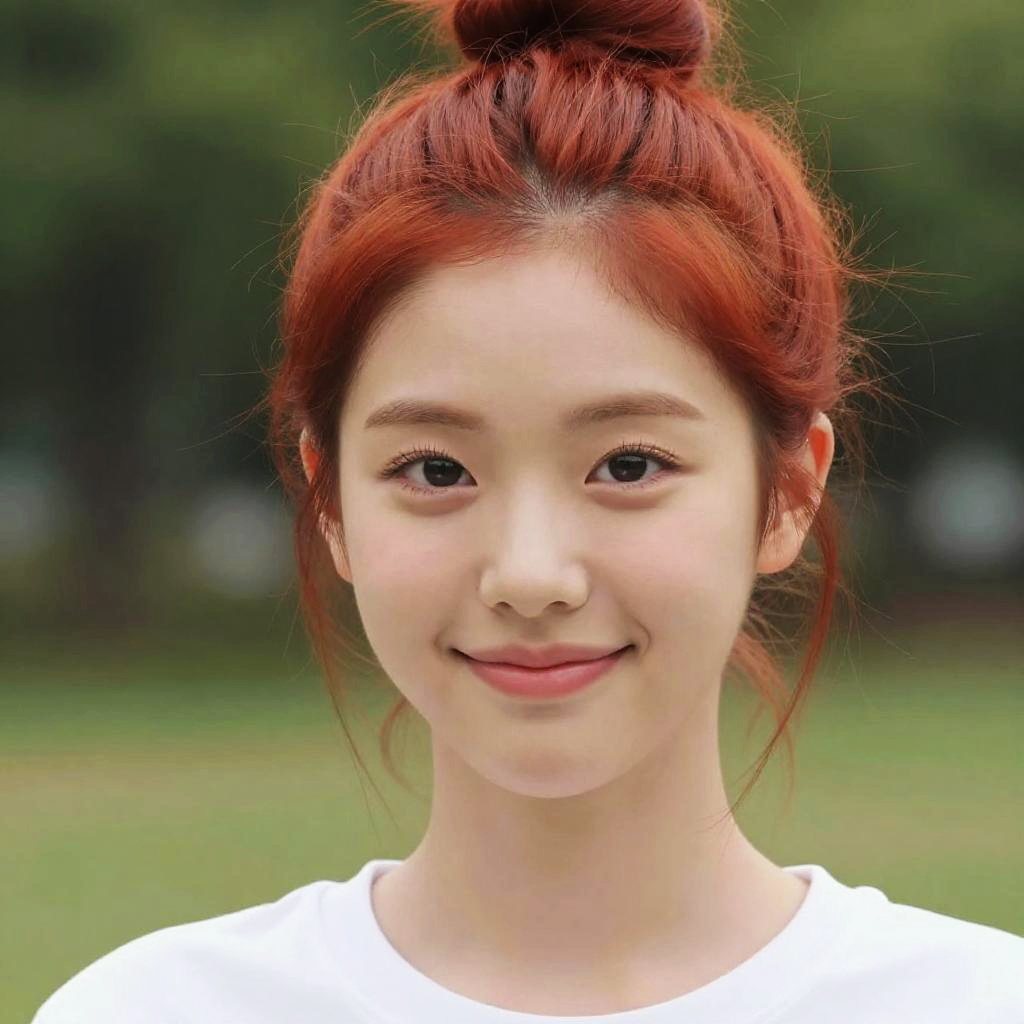 8k, best quality, masterpiece, realistic, ultra detail, photography, HDR, ROW photo, highres, absurdres, cinematic light, official art, depth of field, close-up, slender, cute face, smile, beautiful details eyes, 19years old korean, pretty, Top knot with fiery red color, shirt, park, day