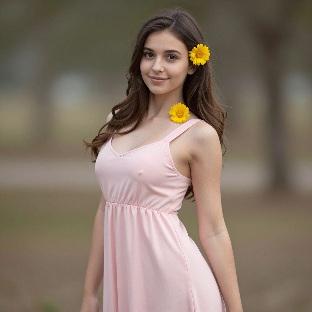 "flowy dance dress, 1girl, solo, dress, pink dress, brown hair, long hair, flower, breasts, looking at viewer, outdoors, blurry, medium breasts, blurry background, smile, bare shoulders, sleeveless, yellow flower, standing Realistic photo of casual sexy person with pretty face"