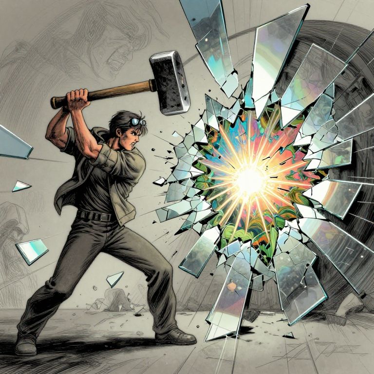 Pieces of scene shown as iridescent reflections on shards of broken mirror flying radially apart from focal point of impact of swinging hammer of graphic-novel angry hero, close-up, breaking through to the other side, standing on left in drab dull gray boring ashen realm of cracked mirror dome sketched in lines pencil, divided from other side by immense cracked shards of mirror, seeing photorealistic beauty color magical nature through hole in looking-glass, in clenched hands he is wielding swinging huge powerful sledgehammer smashing hole in hall of mirrors shattering, rays of beautiful color pierce through cracks in the mirror of realm of nature