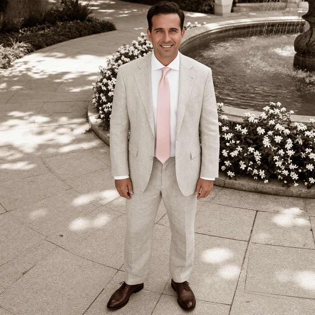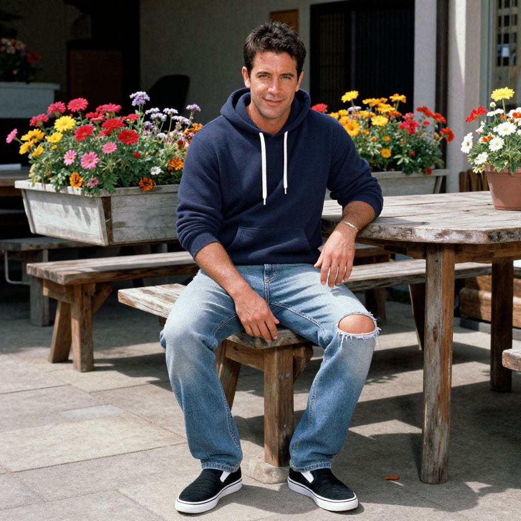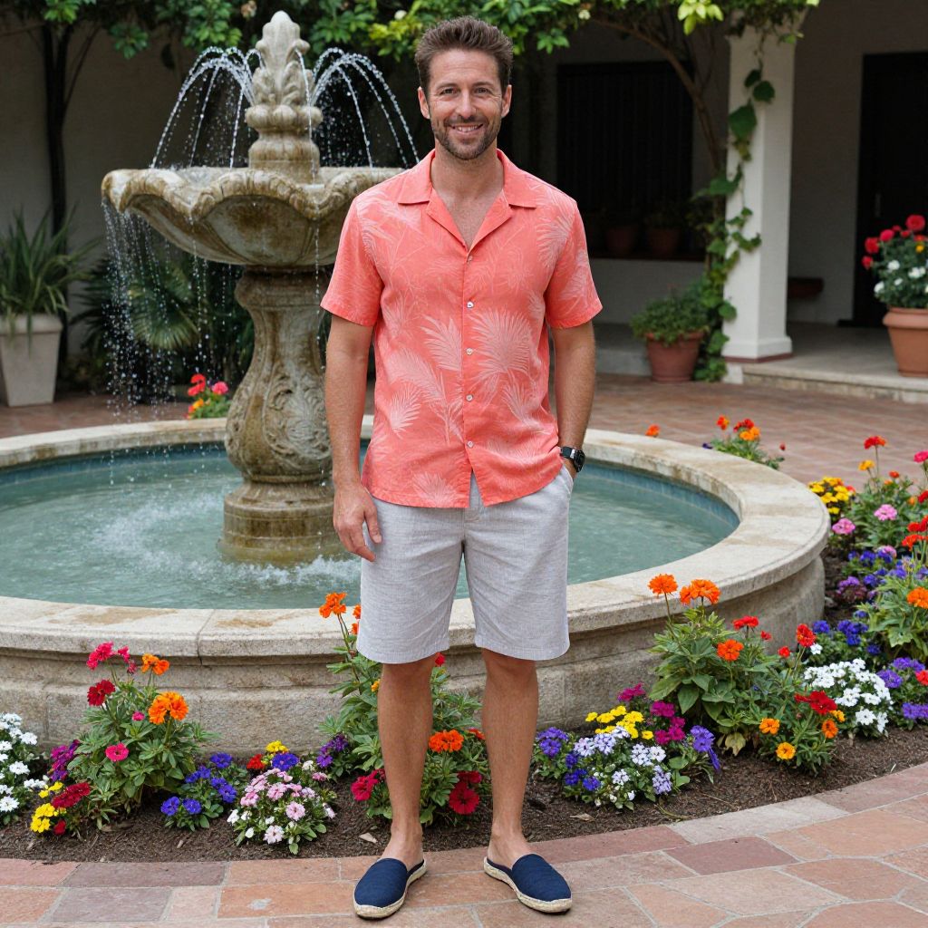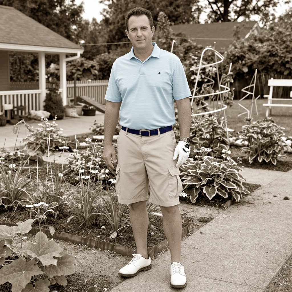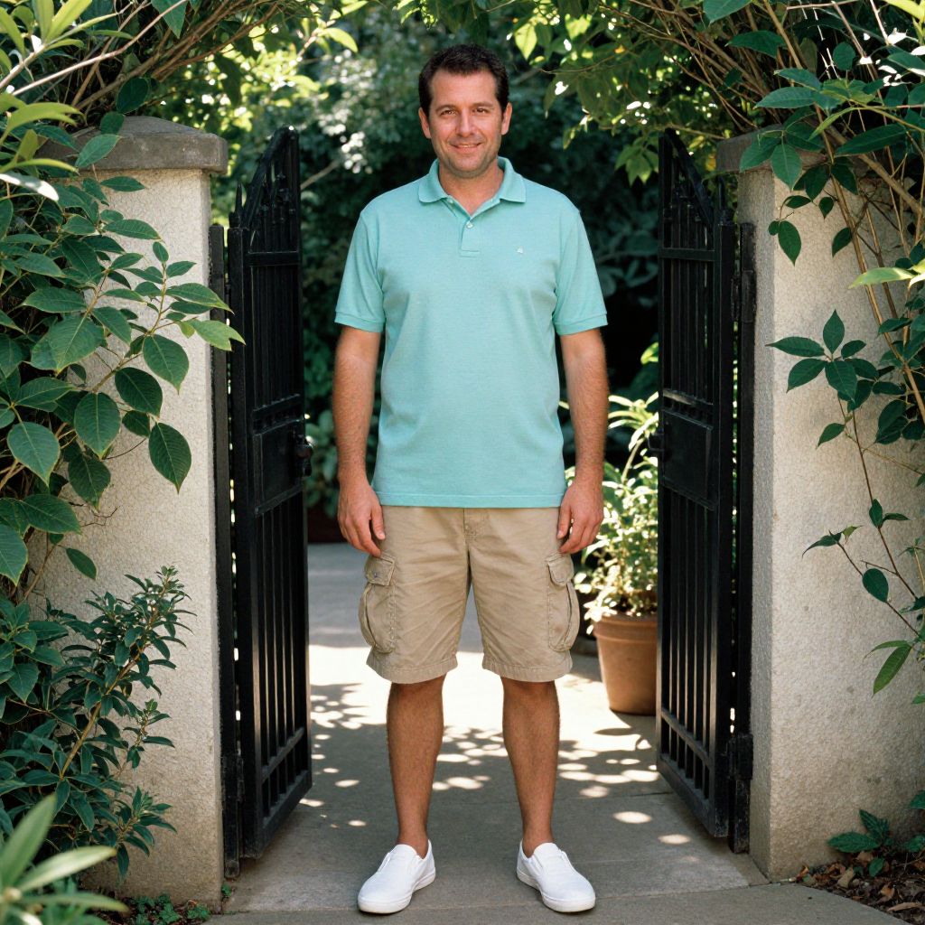 A man, sea green short-sleeve polo shirt, khaki cargo shorts, classic white slip-on trainers, standing in a lush garden entrance, kodacolor analog film style, relaxed smile, enjoying the sunny day. Man has masculine face and piercing eyes