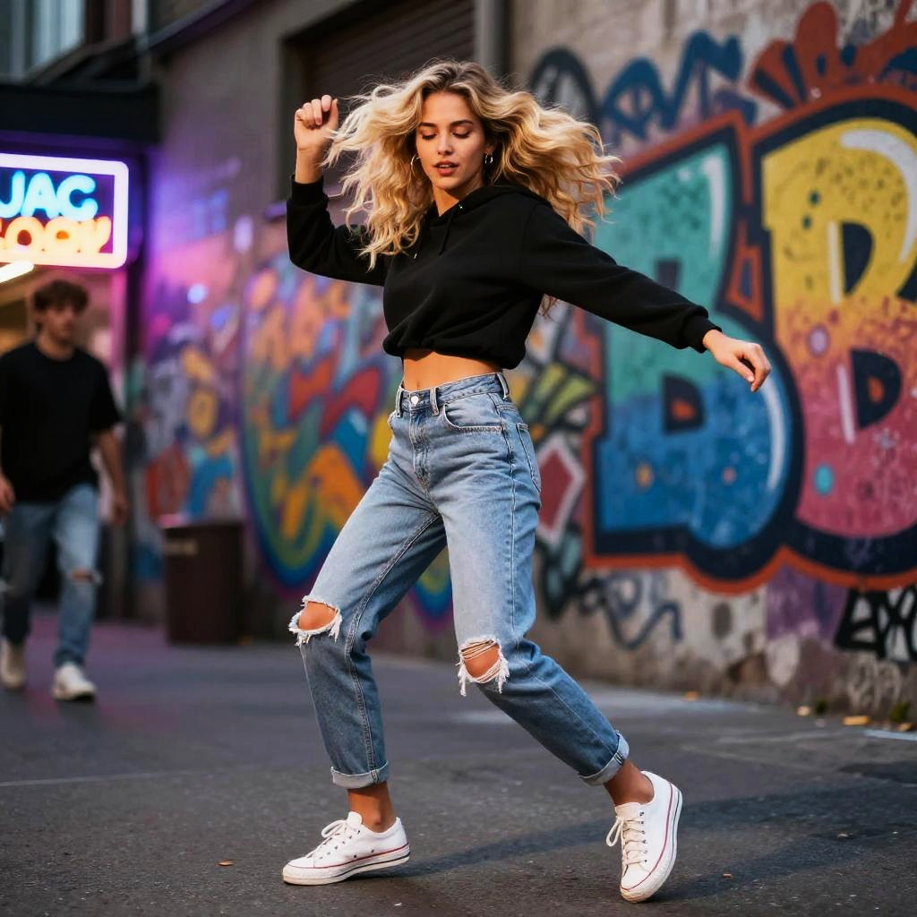 Twerking blonde woman in vibrant urban street setting, neon lights, energetic dance moves, stylish casual outfit, dynamic motion blur, colorful graffiti background, lively atmosphere