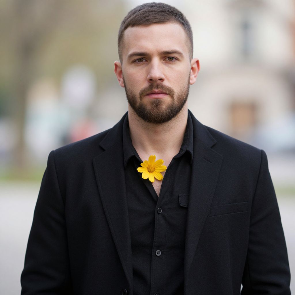 Photograph of a bearded Caucasian man with short brown hair, wearing a black suit and black shirt, standing outdoors. A single yellow flower is placed over his chest, just below the collar. His expression is neutral, with a slight frown. The background is blurred, showing indistinct greenery and light-colored buildings, suggesting a park or urban setting. The image has a shallow depth of field, focusing sharply on the man while the background remains soft. The overall mood is calm and contemplative.