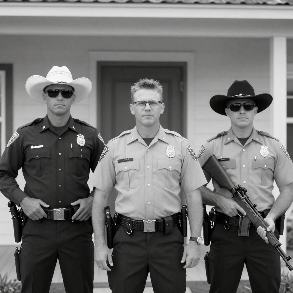 Photograph of two male police officers in dark uniforms with badges, standing in front of a weathered wooden barn door. One officer leans against the door, while the other stands with a hand on his hip, holding a radio. Sunlight casts shadows on the ground.