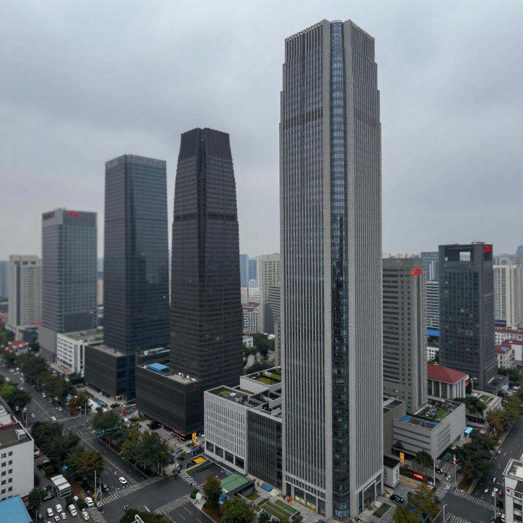 Aerial photo of a modern cityscape with a towering, sleek skyscraper in the foreground. The building is white with black accents, and the camera angle is slightly tilted upwards. The background features a cluster of dark, jagged skyscrapers under a cloudy sky, slightly blurred. The streets below are busy with cars, and the lighting is cool and moody. Depth of field is shallow, focusing on the foreground skyscraper.