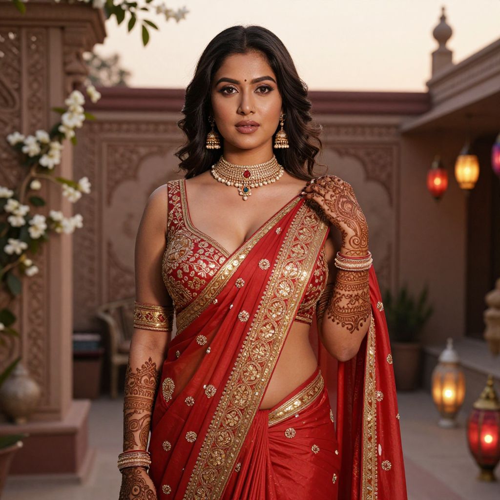 A beautiful Indian woman with deep brown skin, warm brown eyes, and dark wavy hair wearing a vibrant crimson and gold fancy saree costume, the saree draped elegantly with intricate zari work, standing in a traditional henna-etched courtyard at sunset, with jasmine flowers and colored lanterns in the background.. The woman has big tits and cute face