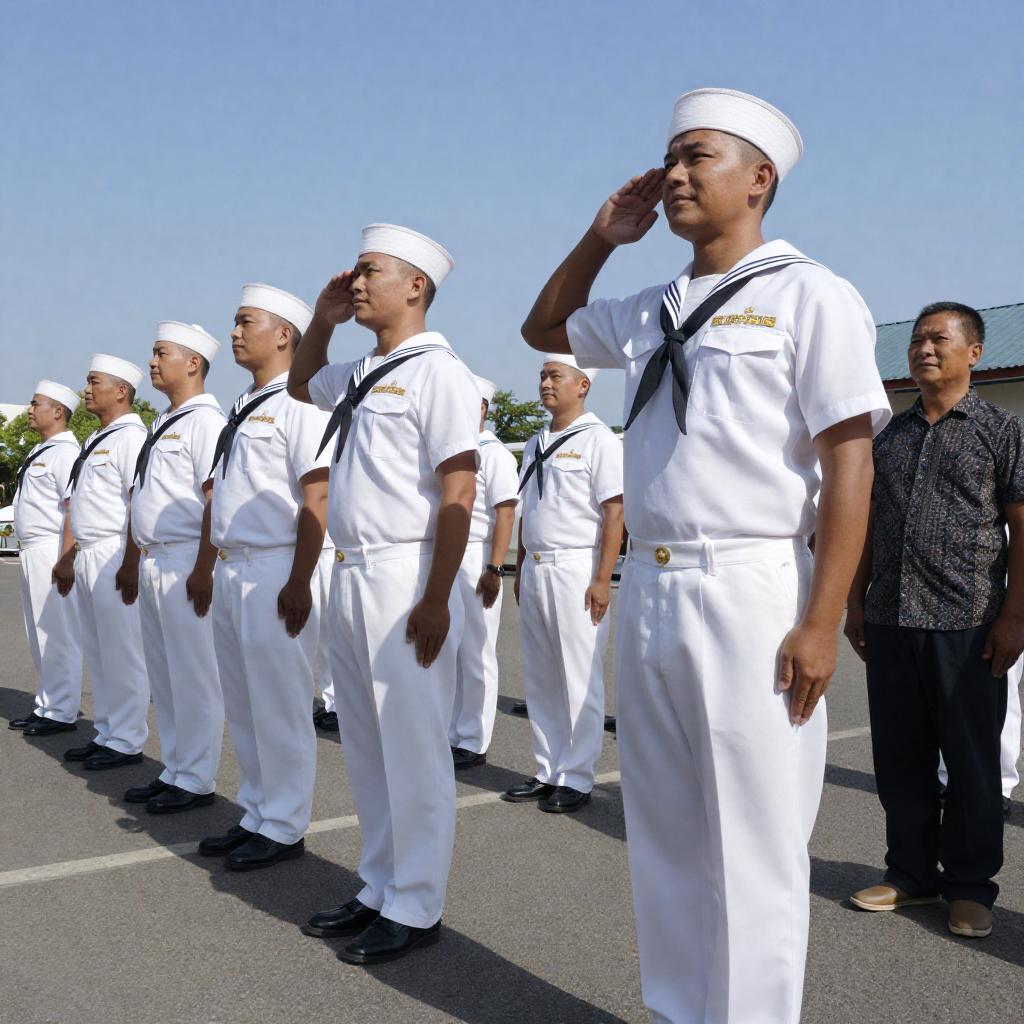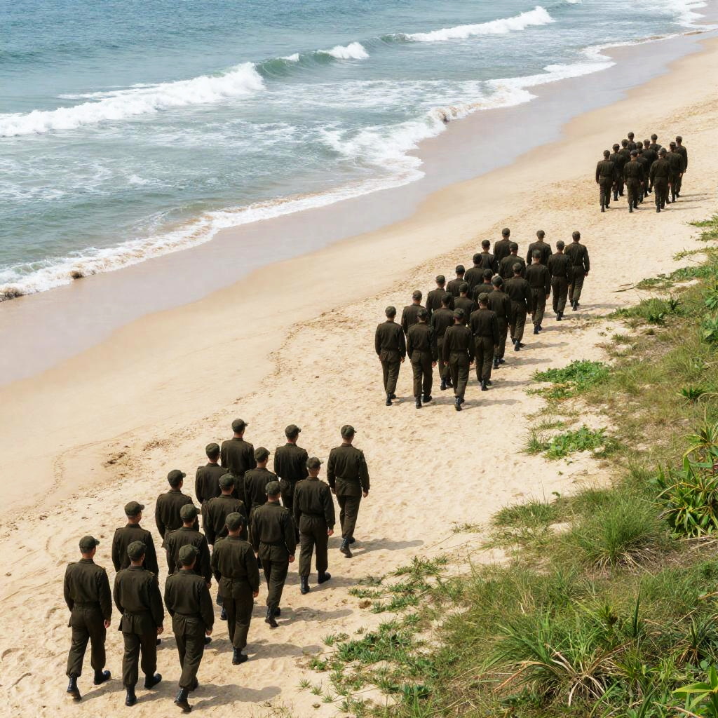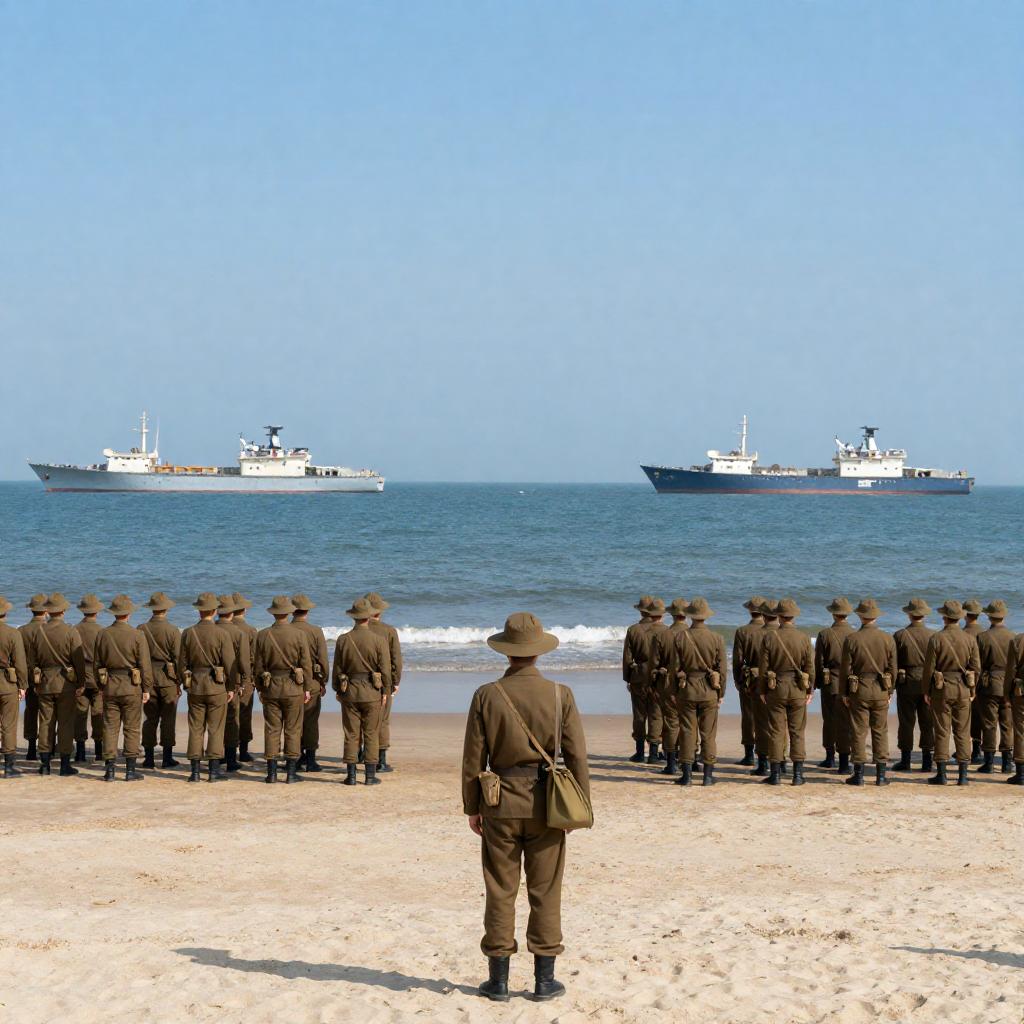 Photograph of a beach scene with a large group of soldiers in brown uniforms standing in two lines facing the ocean. Two ships are visible in the background. A single soldier in the foreground stands with his back to the camera, wearing a hat and carrying a bag. The sky is clear blue.