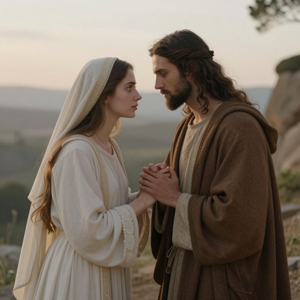 An ethereal bond of compassion and divine connection is forged between Christ and the Samaritan woman, their hands entwined in a gesture of shared hope and spiritual transcendence, set against a serene landscape that whispers of eternal grace and redemption.