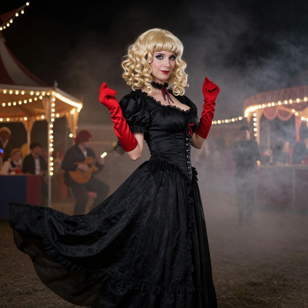 Photograph of a blonde woman in a black Victorian dress with red gloves, standing in a smoky carnival at night. Festive lights and musicians in