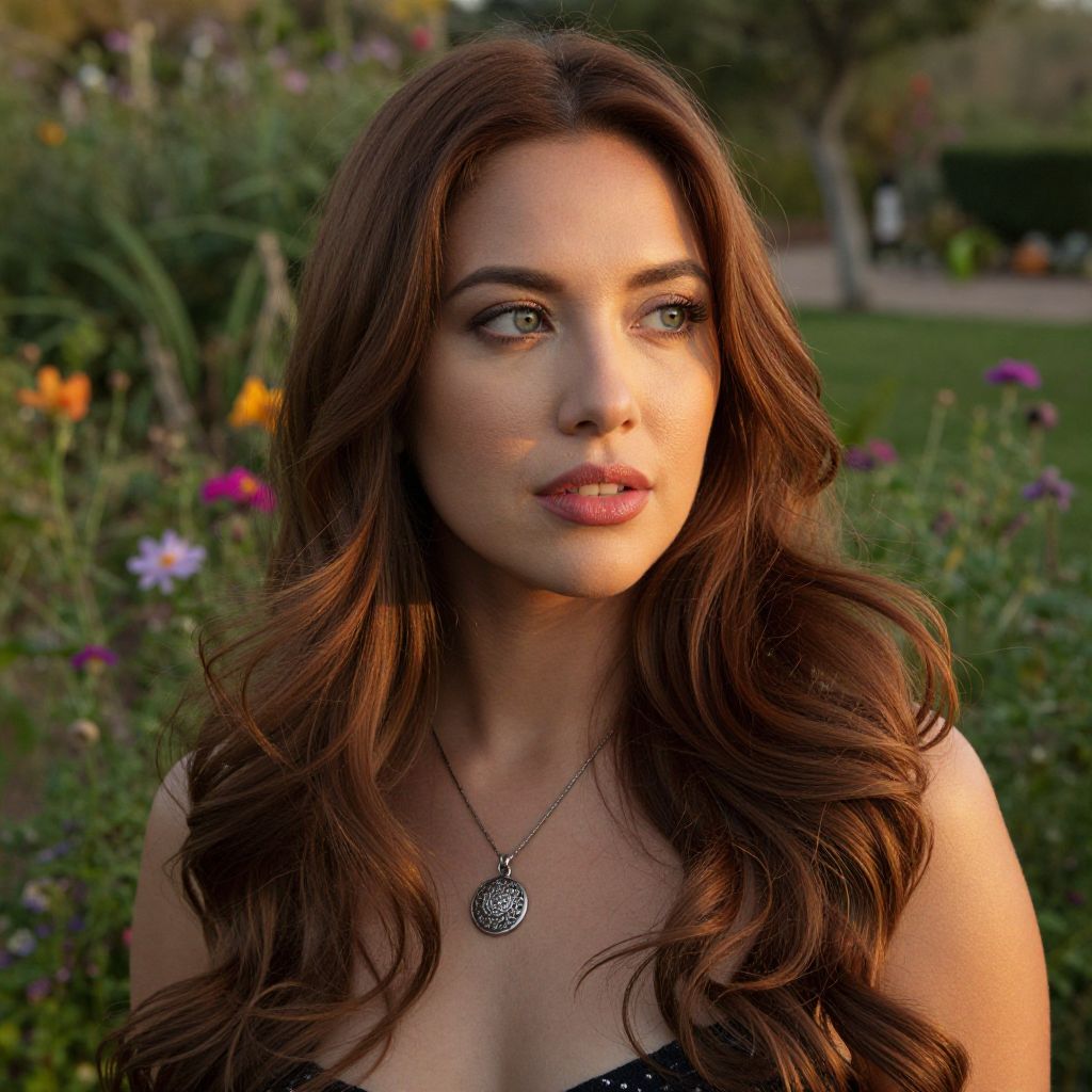 An enigmatic Hispanic woman, her long wavy chestnut hair framing a delicate silver pendant, gazes thoughtfully into the distance with striking green eyes. Soft tendrils of hair cascade over one shoulder as warm golden hour light bathes her porcelain skin in gentle illumination, casting subtle shadows on her refined cheekbones and full rose-tinted lips. Standing alone in a lush garden filled with vibrant flowers and verdant foliage, she exudes both solitude and a deep connection to nature.