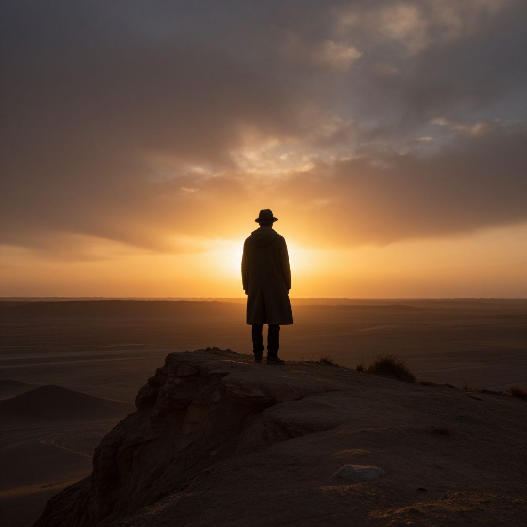 Loneman standing on a windswept cliff at sunset, wearing a long coat and hat, looking out over a vast desert landscape, cinematic lighting, dramatic clouds, high detail, atmospheric mood, rugged and solitary figure