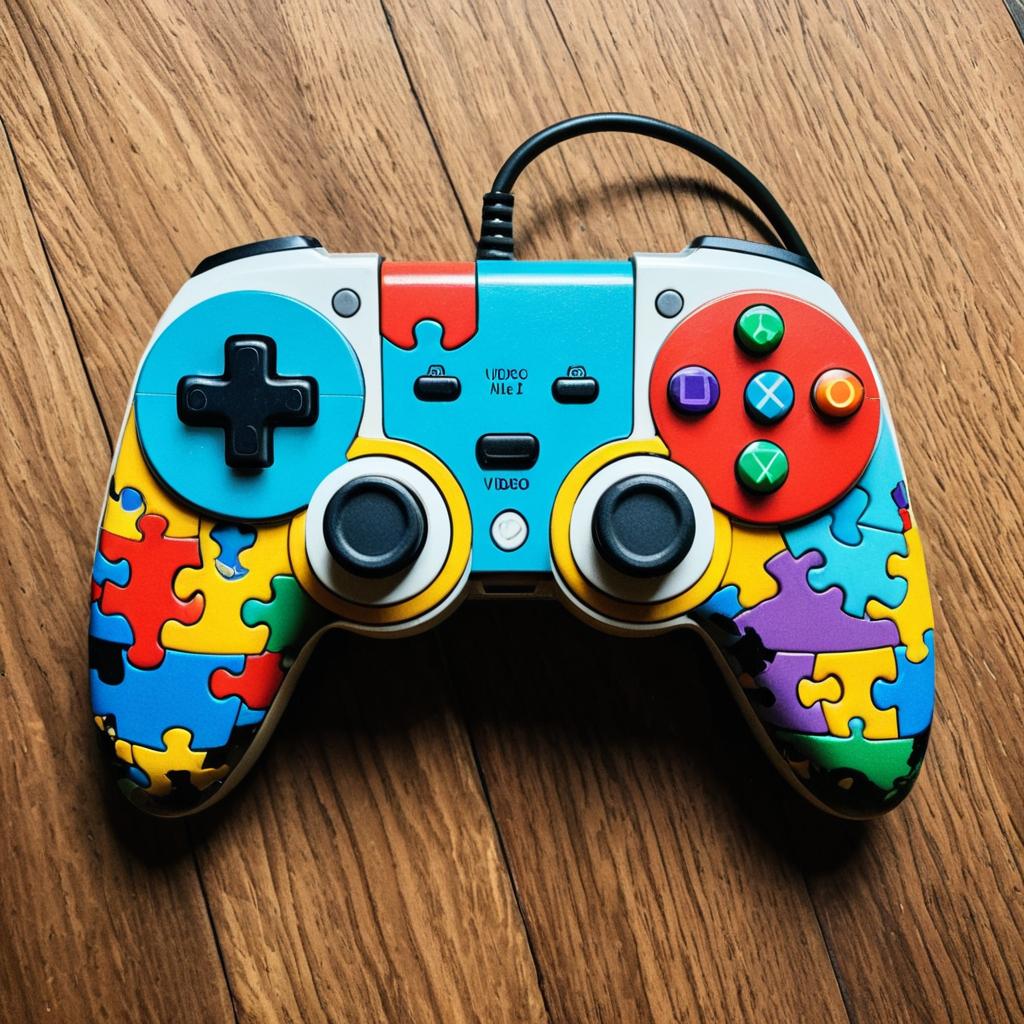 A colorful video game controller made of puzzle pieces, mental wellness through art, styled in a playful and whimsical way.