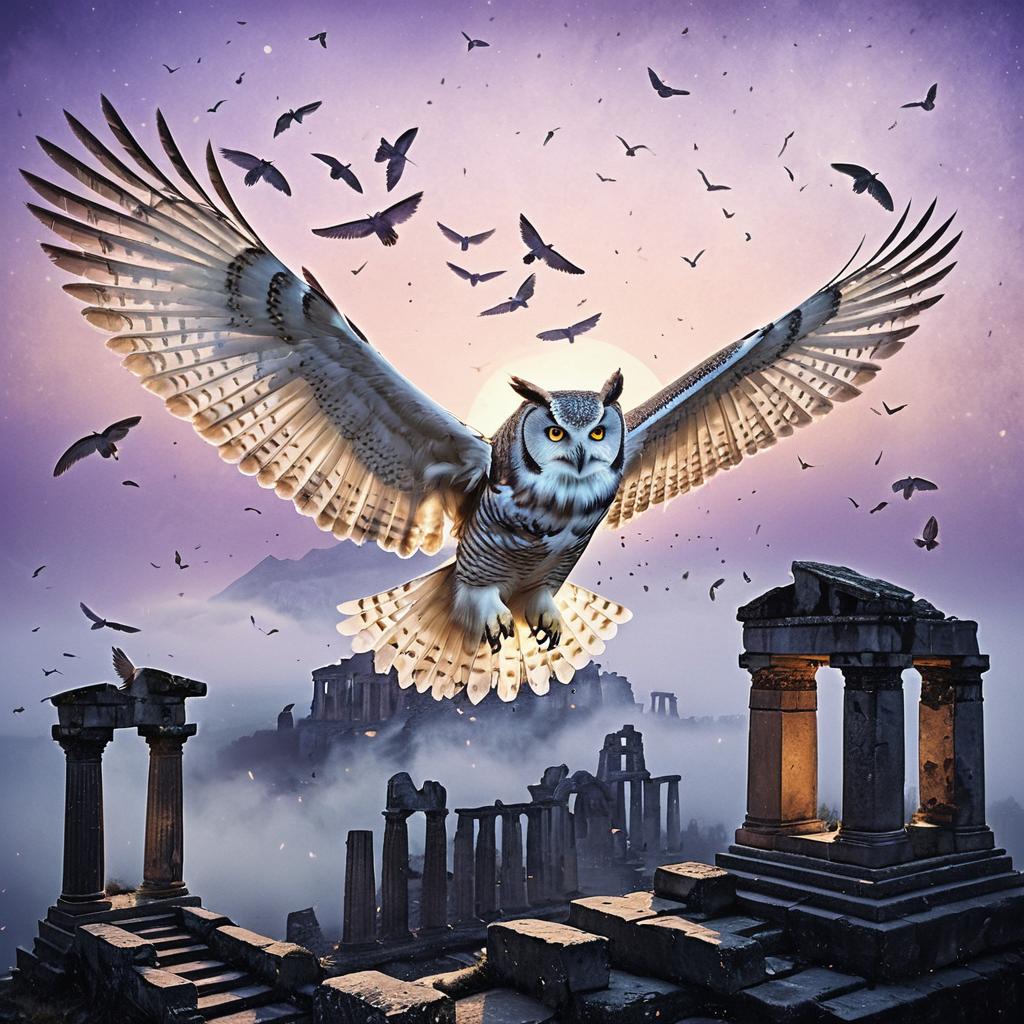 A surreal and dreamlike depiction of an owl with delicate, intricately detailed feathers soaring with wings fully spread. The scene is set at dawn with soft pastel lavender and pink tones illuminating mist-covered ancient ruins reminiscent of classical architecture. Glowing light effects surround the owl, enhancing the whimsical and ethereal atmosphere of the composition.