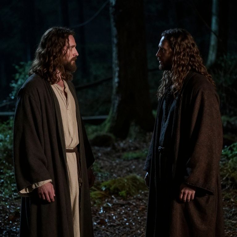 Heptagon Balphomet darkside, at night, on florest, with Jesus, talking, cinematic shot, movie scene, photorealistic, Sharp focus, dark, ultra detail,