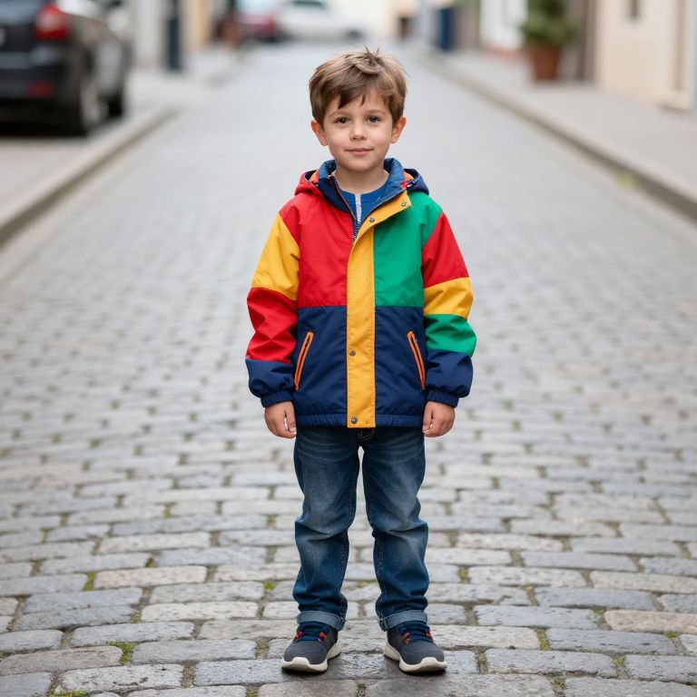 Funny Outfit For Boy, boy in a colorful jacket standing on a cobblestone street