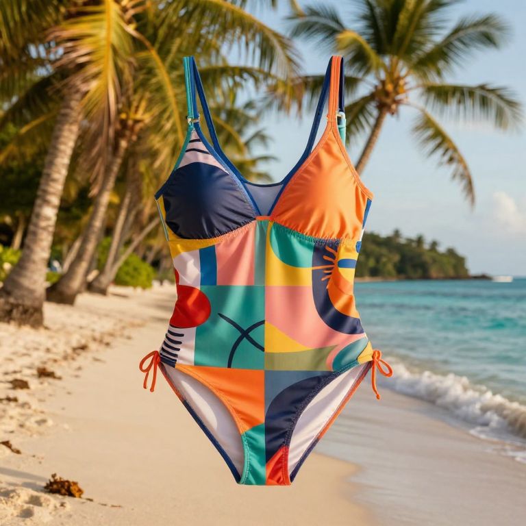 Ortegabikini vivid swimwear on a tropical island setting, colorful geometric shapes mixed with organic elements, lush palm trees in the background, warm golden hour light casting soft shadows, relaxed beach vibe, turquoise waters gently lapping shore