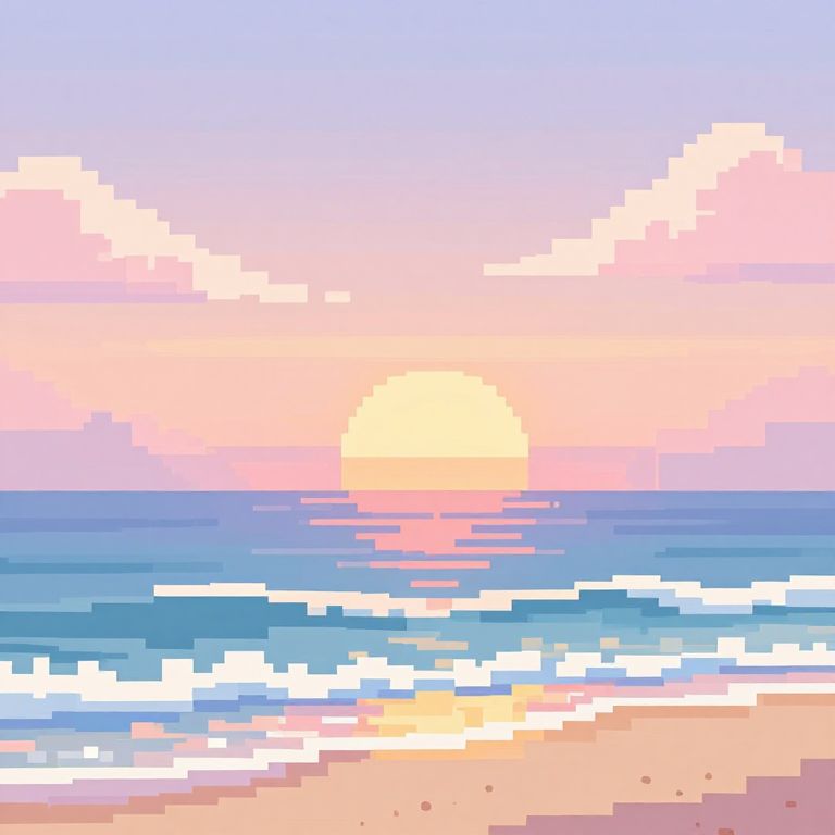 Pixsel style pixel art of a serene beach sunset with pixelated waves, soft pastel sunset colors, highly detailed pixel blocks, dreamy atmosphere, nostalgic pixel art style, minimalistic background with pixel clouds and sandy shore.