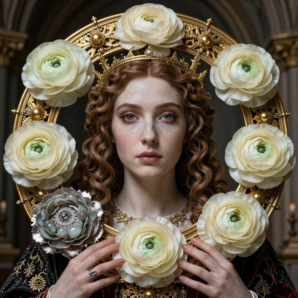 Ivory and ebony and gold and silver and jade amulett of Ranunculus Ron Garney, natural, shimmering, vibrant, gothic, rpg, 1400ad, ultra detailed, detailed, immersive, reminiscent of high fantasy RPG games, HD, masterpiece, best quality, hyper detailed, super realistic, perfect face, perfect hands, award-winning, professional, breathtaking, linquiveradecorative Fenbetter weatherrenaissance style . realistic, perspective, light and shadow, religious or mythological themes