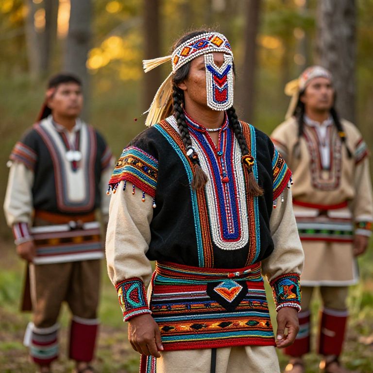 Photograph of a person standing in a sunlit, sandy parade area, wearing a traditional Native American headdress with black, spiky feathers. They have a white shirt with intricate, metallic shoulder armor, and a fringe skirt with red and black details. Their face is painted in traditional patterns. Background shows blurred, colorful flags and people. The image has a vibrant, high-contrast style.