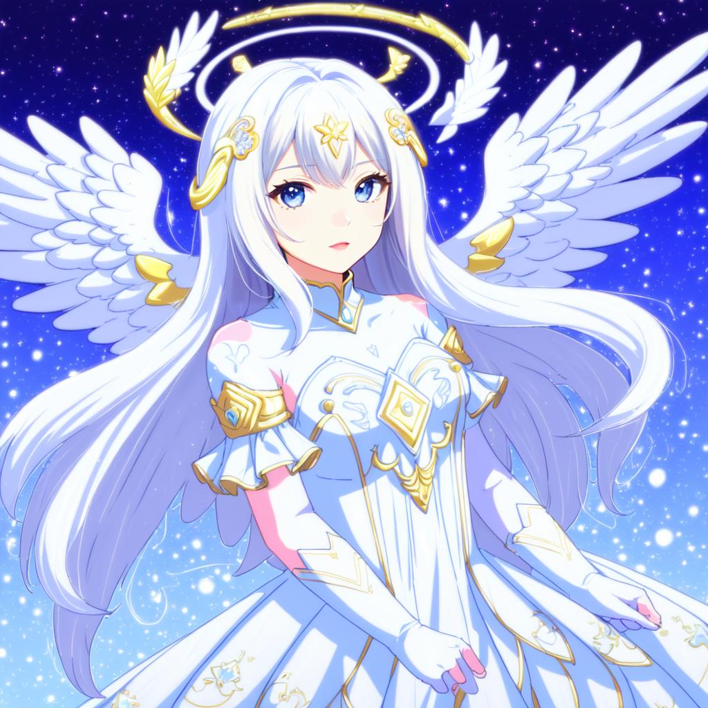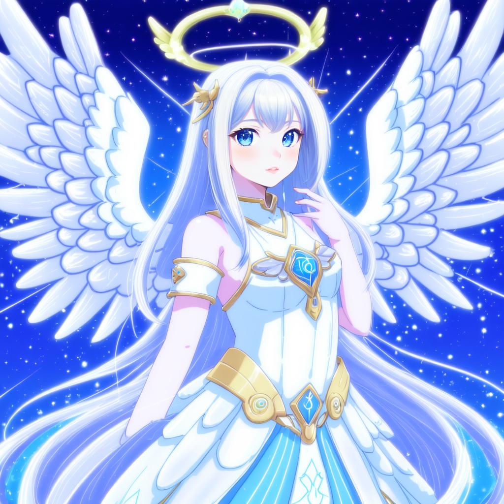 Anime-style illustration of a female angel character with long white hair and blue eyes. She has a golden halo above her head and large white wings. She is wearing an ornate white and blue dress with gold accents and wing motifs, along with matching arm accessories. The background features a starry night sky with glowing elements.