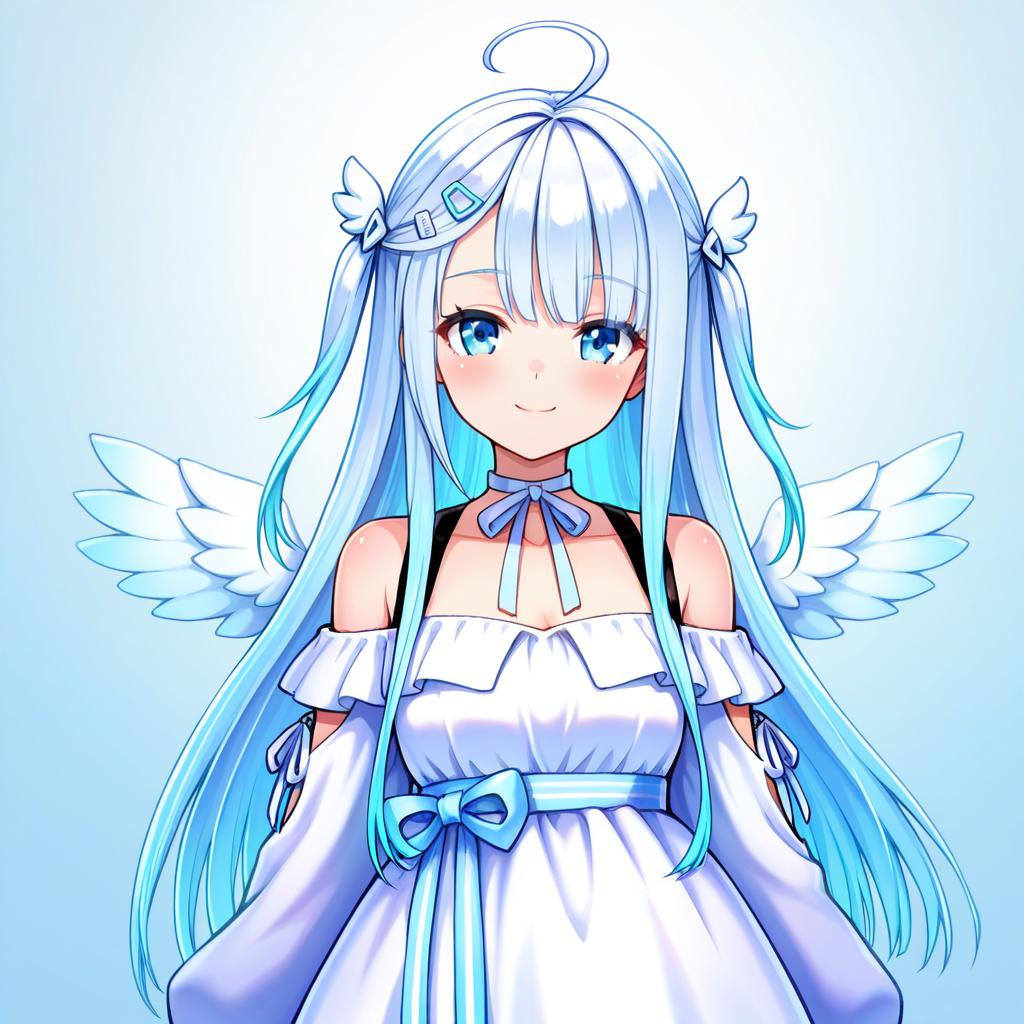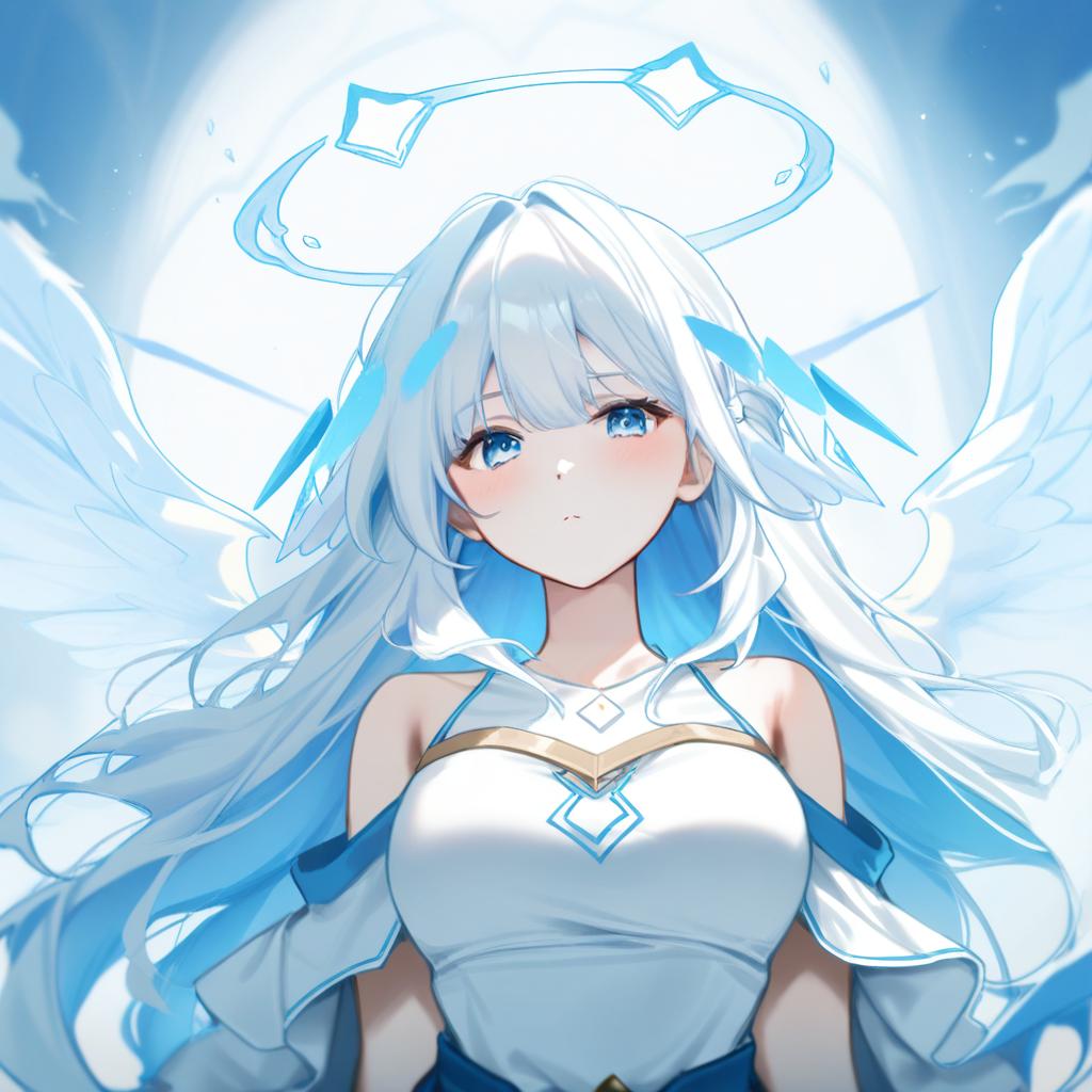 Angel girl (shimmer), original, 1girl, angel, blue eyes, white hair, long hair, medium breasts, halo, by artist hanazawa suou, anime