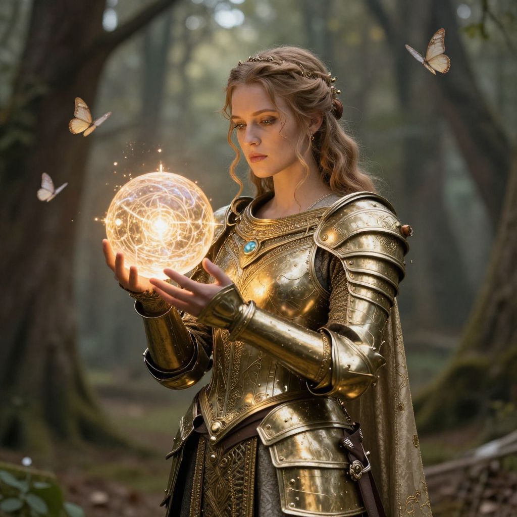 A woman dressed in ornate, golden medieval armor holds a glowing, magical orb in a mystical forest bathed in soft sunlight. Surrounded by delicate butterflies, the scene combines fantasy and realism with intricate costume details and a serene, ethereal atmosphere.