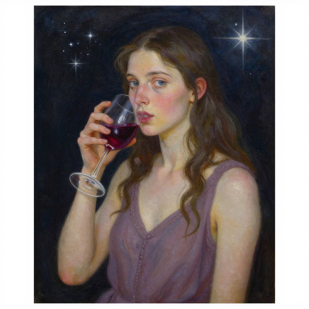 Oil painting of a young woman with wavy brown hair, fair skin, and blue eyes, sipping red wine against a dark starry background.
