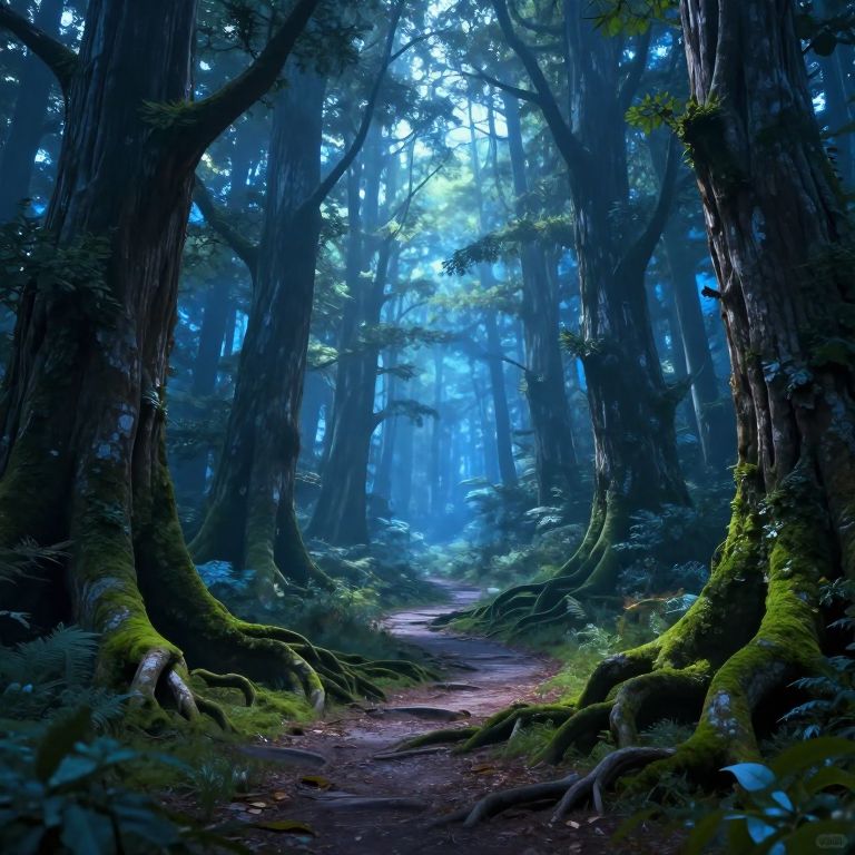 A serene 3D-rendered forest bathed in ethereal blue light, featuring towering trees with moss-covered roots and a winding path, evoking the mystical ambiance of an ancient woodland where dreams and symphonies intertwine.