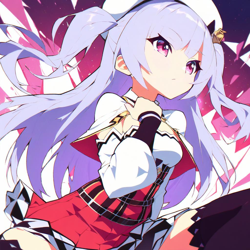 Digital anime-style artwork featuring a girl with long purple hair tied in two side ponytails, red and purple eyes, wearing a white capelet, red skirt with black and white details, black pantyhose, white headwear, and detached long sleeves. The character has a determined expression and is set against a vibrant, abstract background.