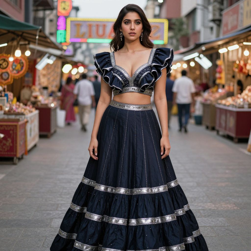 A modern fashion-forward woman with bright hazel eyes and an elegant, slightly smoky complexion, dressed in a luxurious designer ruffle lehenga with layered ruffles and metallic silver trim, posing in a contemporary urban market square with traditional Indian artistry and neon lights in the background.. The woman has big breasts and cute face