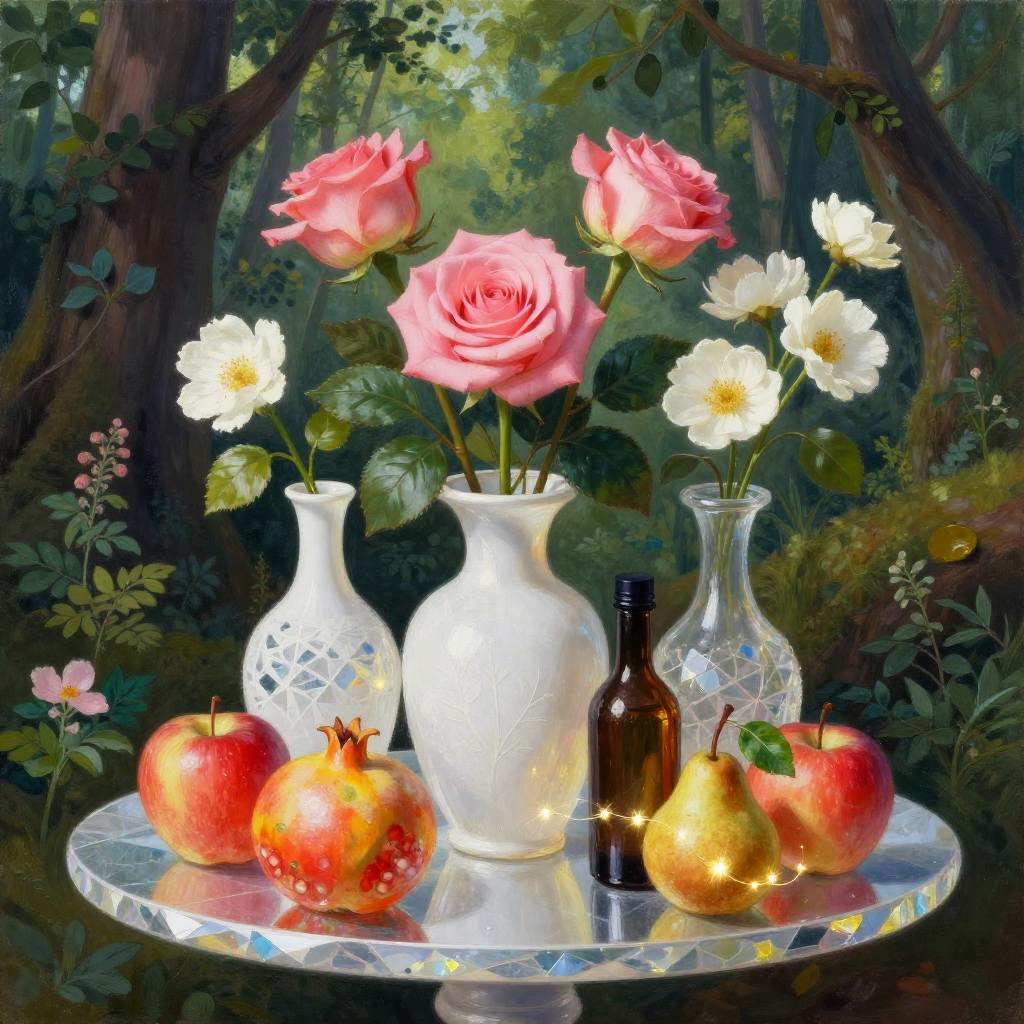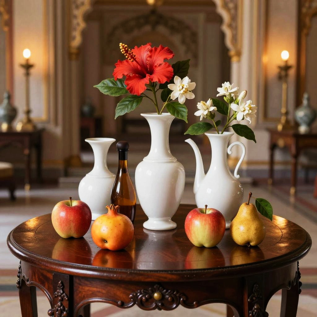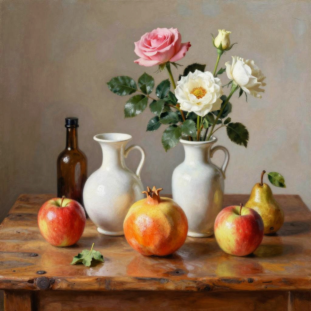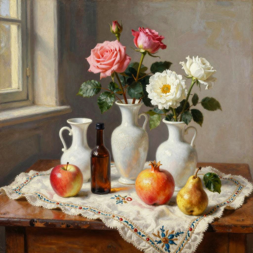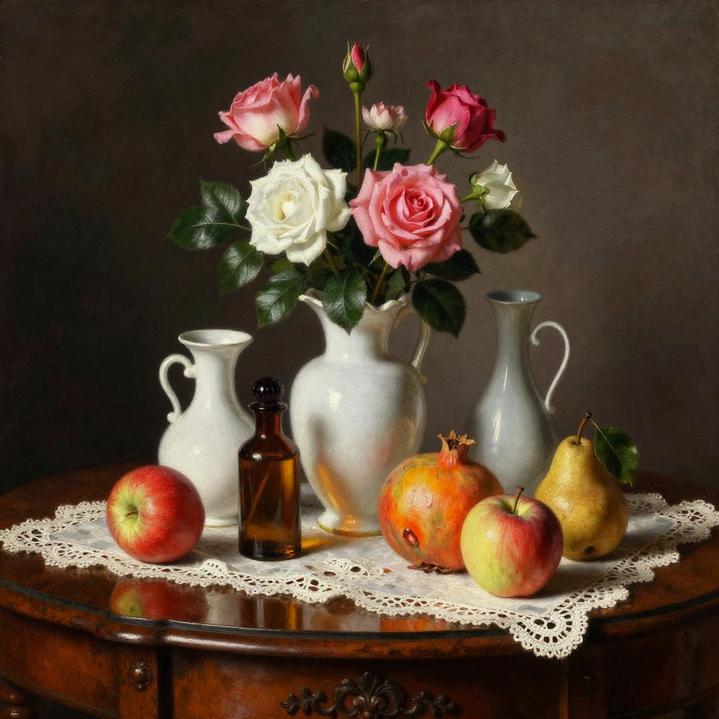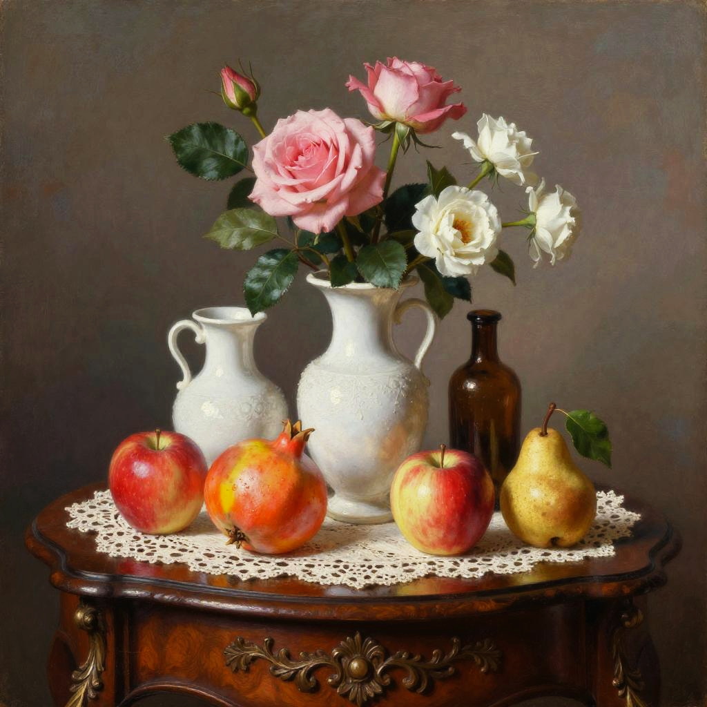 Romanticism oil painting, ornate Victorian mahogany side table with lace runner, still-life featuring three white vases of varied shapes and a small brown bottle with a dark top; pink roses and white flowers with lively green leaves; fruits arranged around them: a red apple, a yellow-orange pomegranate, another red apple, and a small brown pear with a green leaf; soft candlelight flicker; realistic textures, crisp edges, gentle reflections, soft falloff, color-true, editorial quality