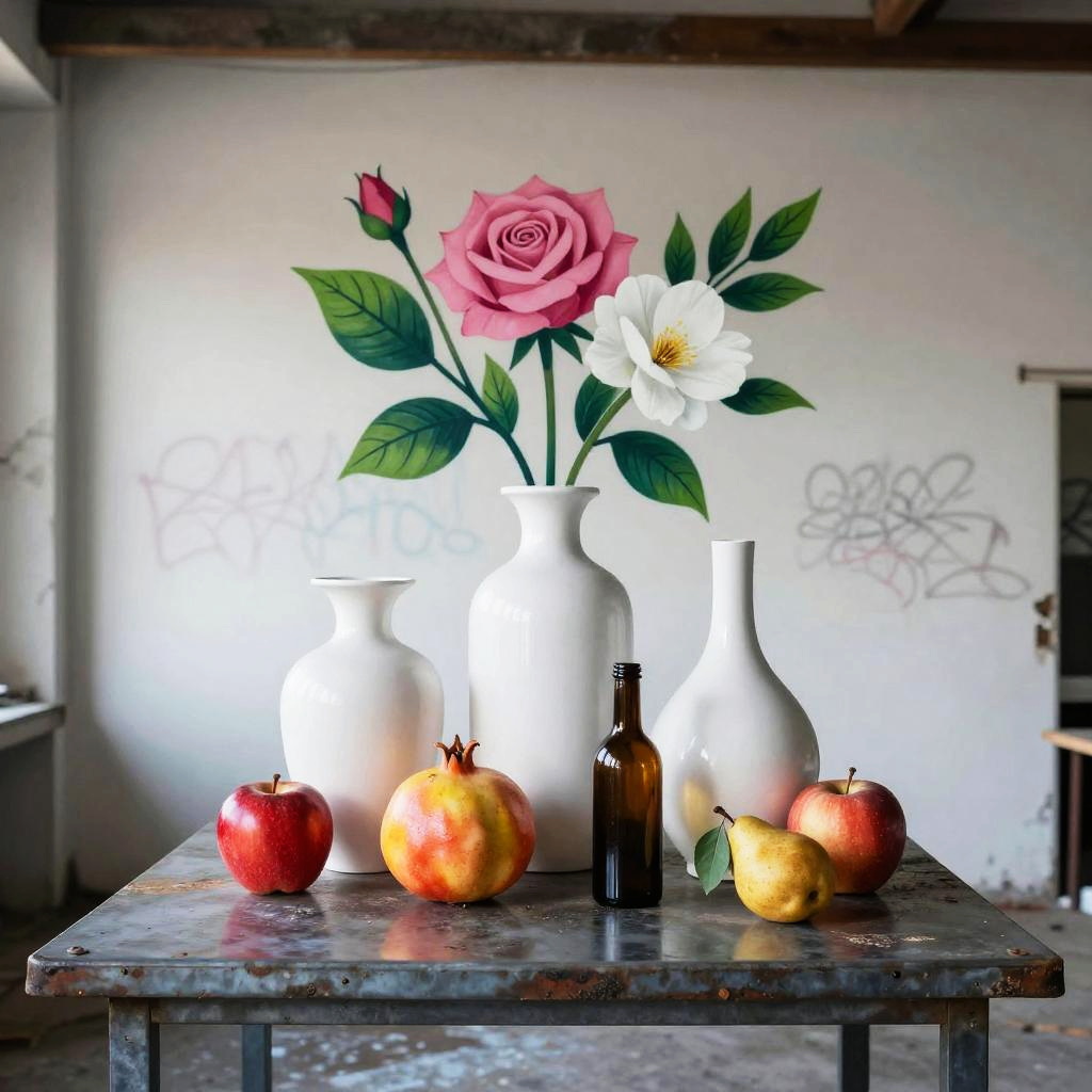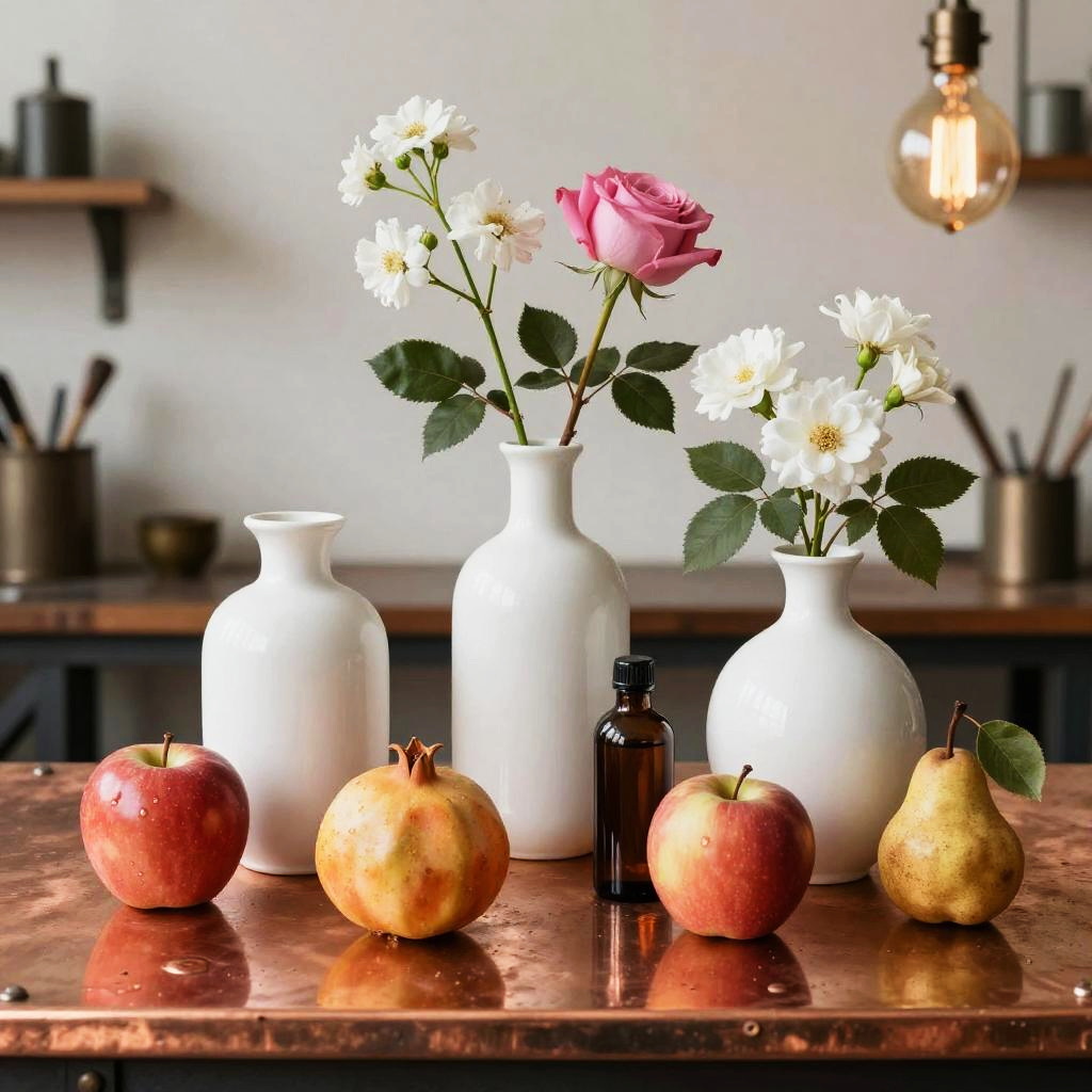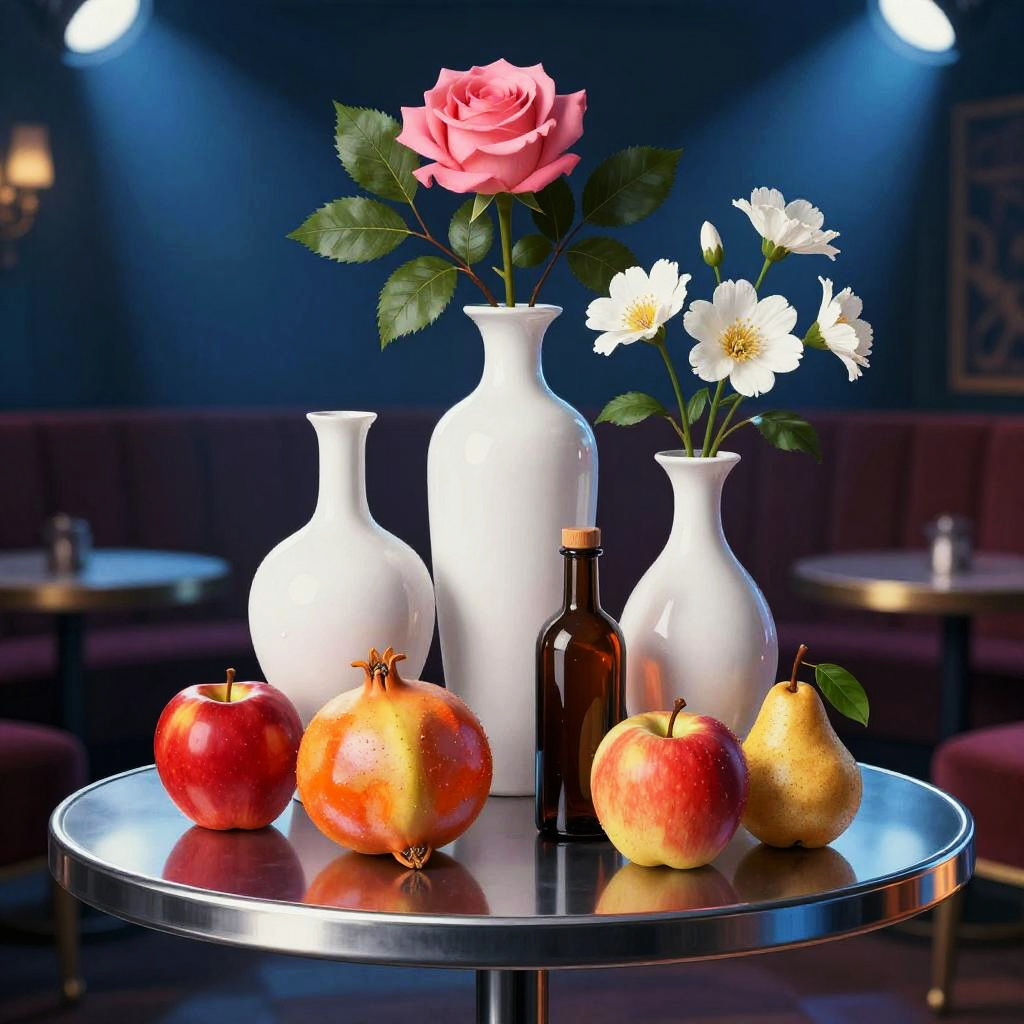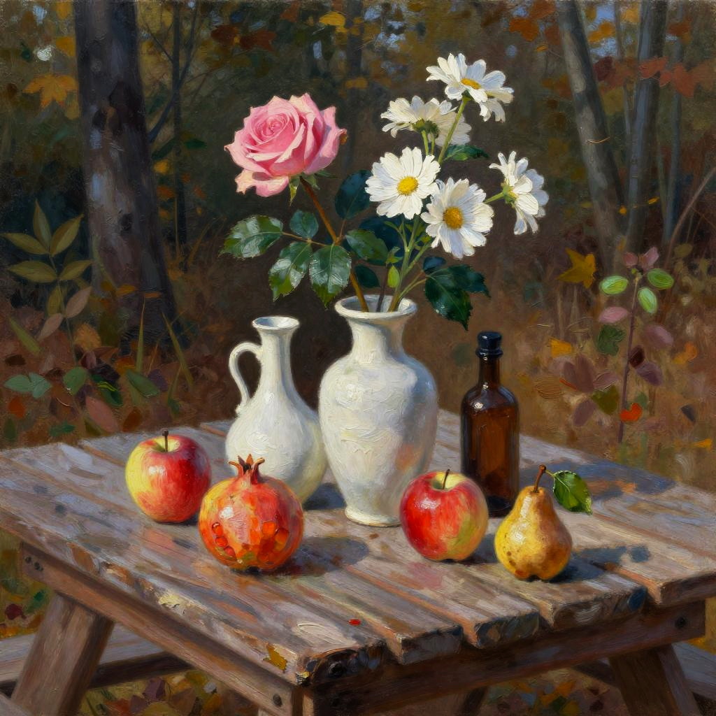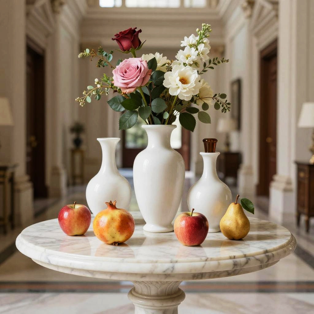 Romanticism oil painting, ornate Victorian mahogany side table with lace runner, still-life featuring three white vases of varied shapes and a small brown bottle with a dark top; pink roses and white flowers with lively green leaves; fruits arranged around them: a red apple, a yellow-orange pomegranate, another red apple, and a small brown pear with a green leaf; soft candlelight flicker; realistic textures, crisp edges, gentle reflections, soft falloff, color-true, editorial quality