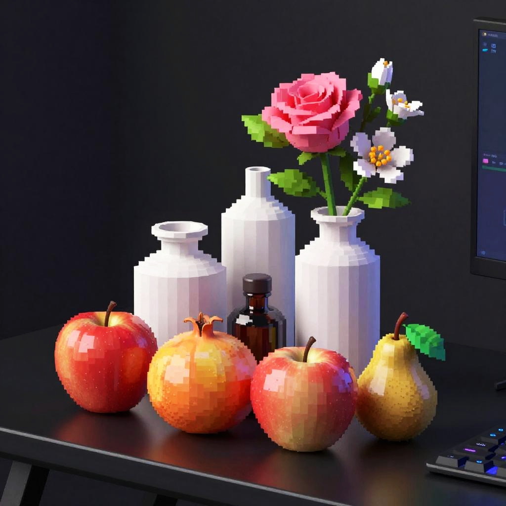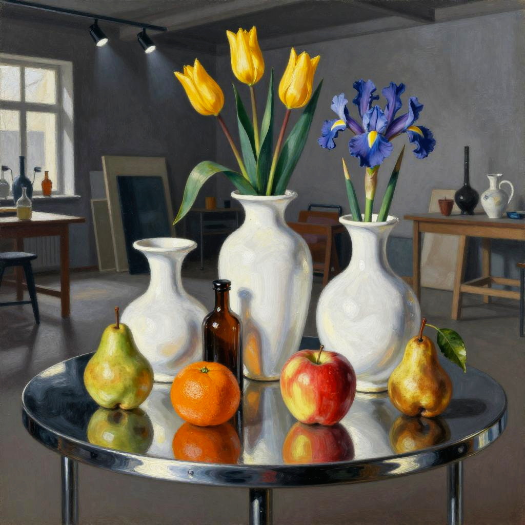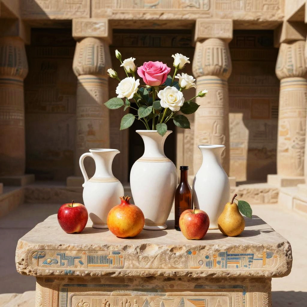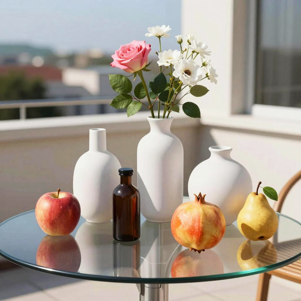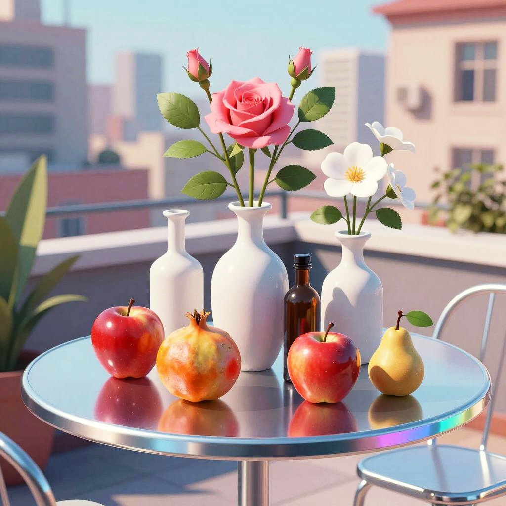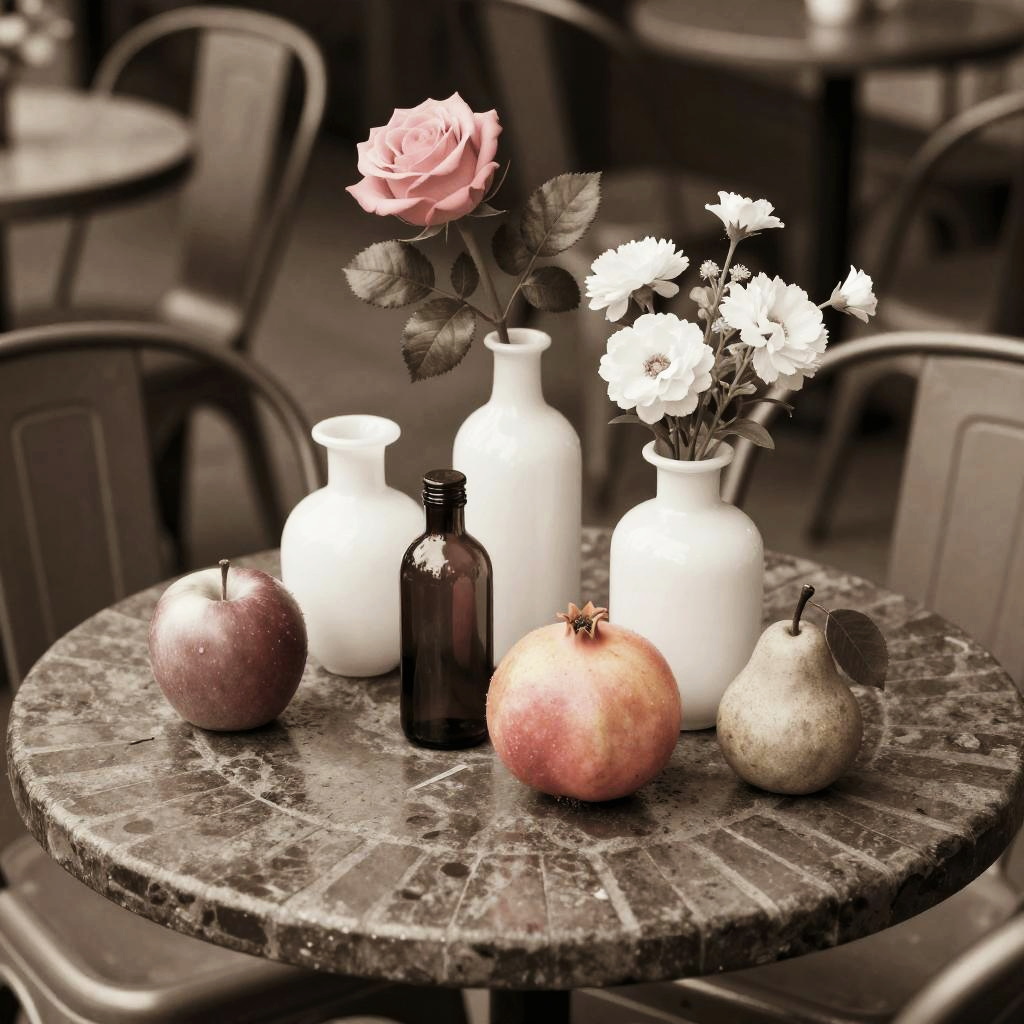 Romanticism oil painting, ornate Victorian mahogany side table with lace runner, still-life featuring three white vases of varied shapes and a small brown bottle with a dark top; pink roses and white flowers with lively green leaves; fruits arranged around them: a red apple, a yellow-orange pomegranate, another red apple, and a small brown pear with a green leaf; soft candlelight flicker; realistic textures, crisp edges, gentle reflections, soft falloff, color-true, editorial quality