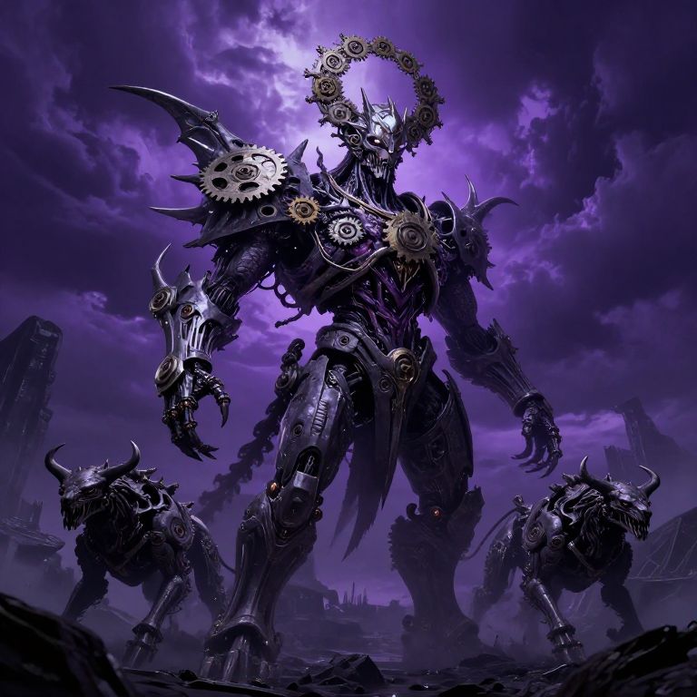 Digital artwork of a towering, dark purple, mechanized warrior with intricate, gear-like armor and sharp, metallic claws. The figure stands dominant in a stormy, purple-hued sky, with two smaller, horned, robotic creatures crouching at its feet. The warrior's helmet features a halo of gears, and its body is adorned with various gears and spikes. The background includes ruined, Gothic-style structures partially obscured by mist. The overall style is futuristic and cyberpunk, with a dramatic, ominous atmosphere.