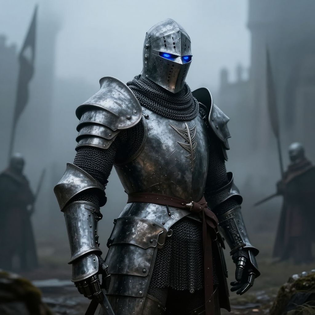 Photorealistic digital artwork of a silver-armored knight with blue glowing eyes standing in a foggy medieval battlefield, surrounded by blurred, shadowy figures