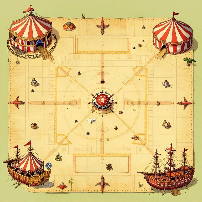 Renaissance a carnival circus pirate ship, festive, top-down view everything, dnd map, battle map, grid map, game board, fantasy art, minimalist, studio ghibli style, 8k,