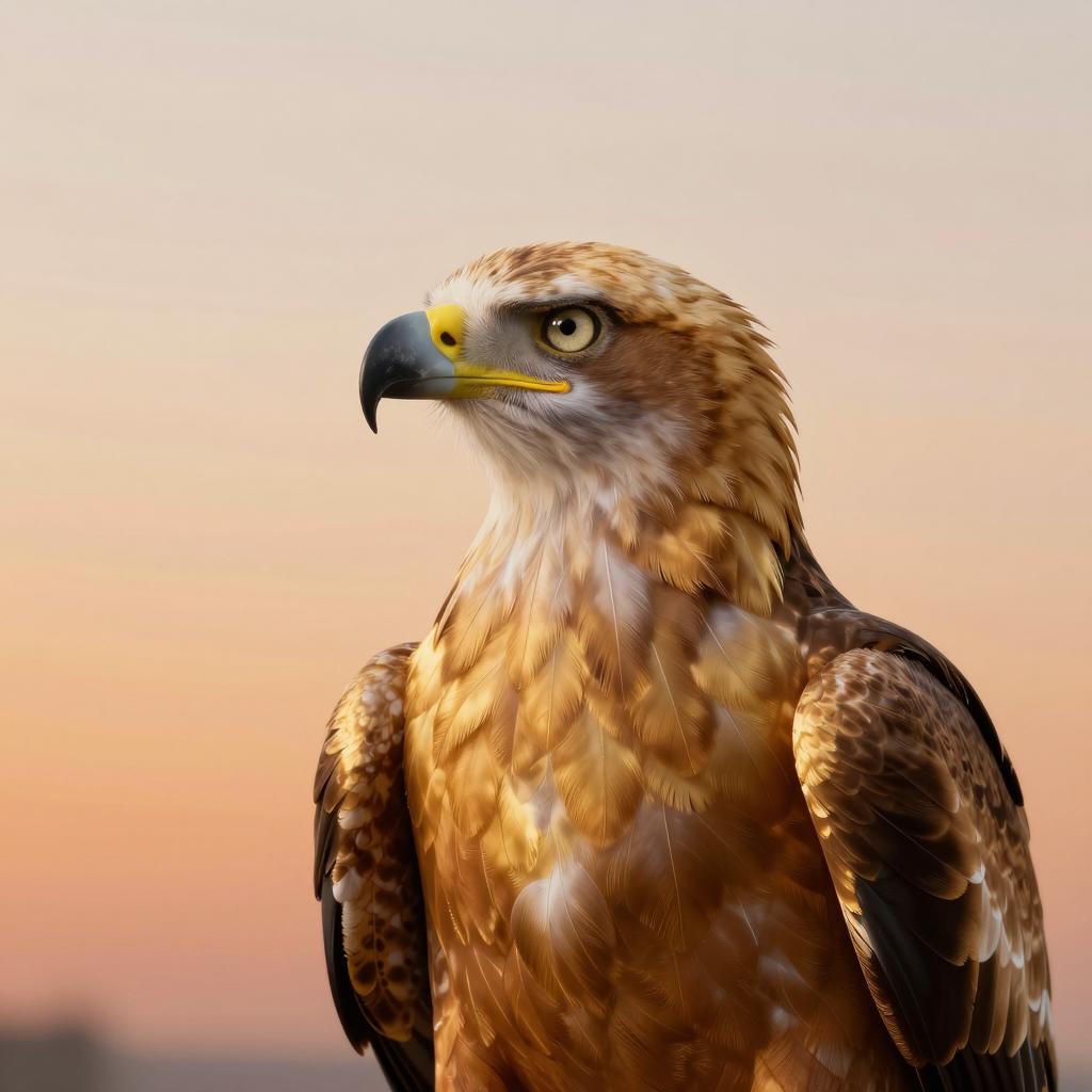 Close-up macro portrait of a golden eagle featuring intricately detailed golden feathers against a soft orange gradient sunset background. The image showcases photorealistic textures, sharp focus, and high definition quality, highlighting the eagle's intense gaze and intricate plumage.