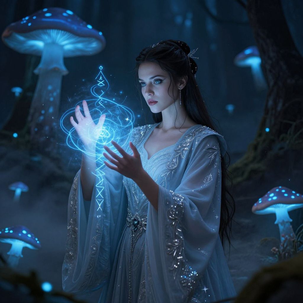 Yelena, a mysterious sorceress in a dark forest illuminated by glowing blue mushrooms, casting a powerful spell with magical runes swirling around her hands, wearing an elegant robe with silver embroidery, ethereal fog enveloping the scene.
