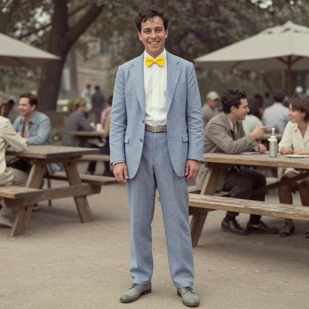 A man, slate blue seersucker suit, white linen dress shirt, vibrant yellow bow tie, gray leather derby shoes, gray leather belt, sun-drenched plaza, wooden picnic tables, cheerful laughter and chatter, hand-tinted photograph, joyful expression. Man has masculine face and piercing eyes