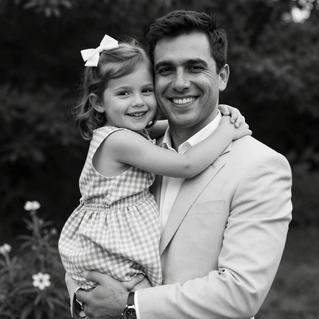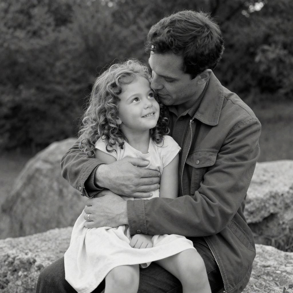 Black-and-white photograph of a man and a young girl hugging. The man, with short dark hair, wears a ured jacket, cradling the girl who has curly hair and a light dress. Background features trees and rocks. Man's face shows a gentle expression, girl looks up with a smile. Man's right hand supports her head, his left arm around her. They are seated on a rock.