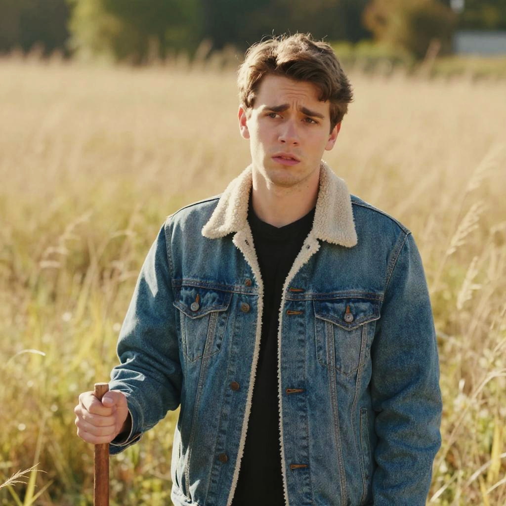 Captivating portrait of a solitary figure, set against an expansive, sun-kissed landscape, where rolling hills meet the infinite sky. The subject stands tall, dressed in casual attire, his gaze directed towards the distance, exuding serenity and introspection. Soft focus, golden hour lighting, with wispy clouds drifting lazily across the horizon, Man has masculine face and piercing eyes