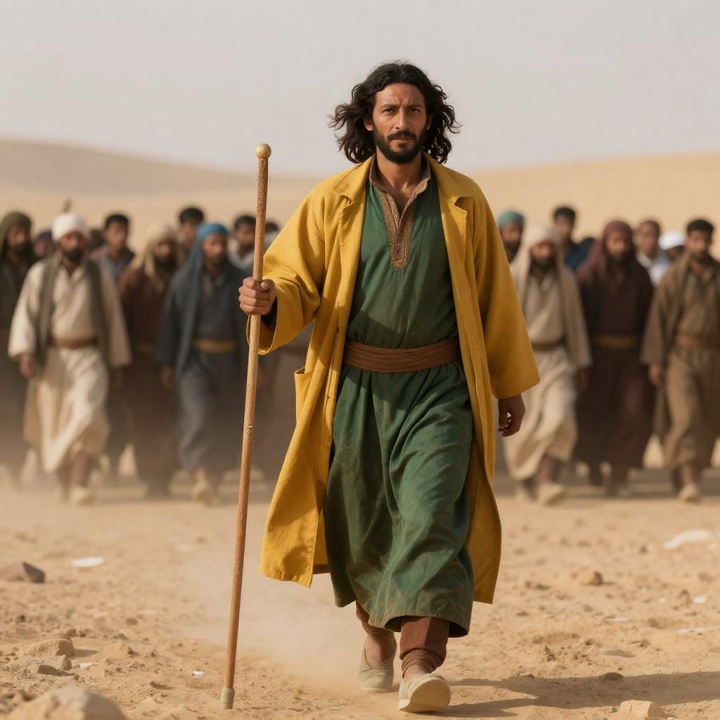 Ancient desert scene, sunset. Group of people on stage. Central shirtless man with white loincloth, muscular, pointing. Right, woman in white robe, veiled, holding staff. Left, diverse people, some shirtless, some in dark clothing. Background, orange-hued desert city. Crowd in foreground. Intense expressions, dynamic poses.