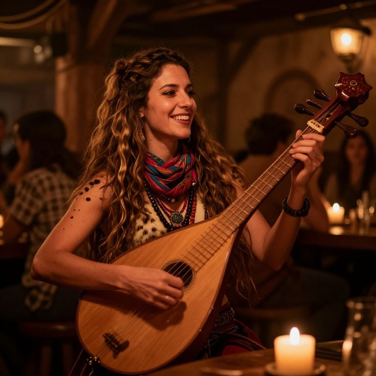 Photograph of a smiling woman with long, wavy brown hair playing an acoustic guitar in a warmly lit, rustic bar. She wears a colorful, patterned scarf, black sleeveless top with black spots, and multiple beaded necklaces. Her skin is tan, and she has dark eyes. The background shows blurred patrons and candles, creating a cozy, intimate atmosphere. The image has a rich, warm color palette with golden candlelight illuminating her face and guitar. The bar's wooden texture and soft focus add to the inviting, relaxed setting.