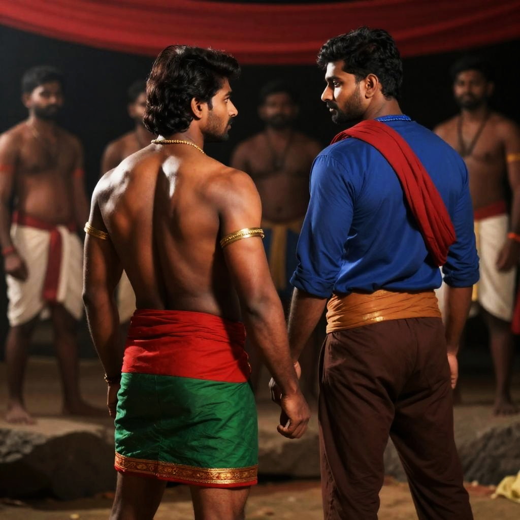 Muscular man with dark hair, bare chest, red and green loincloth, gold arm bands, head back, facing another man in blue shirt, brown pants, red cloth over shoulder. Four people in background, standing on rocks under red canopy. Dramatic lighting.