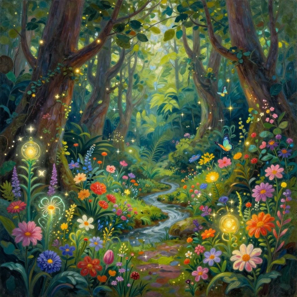 Fantasy fruit art with swirling vines bearing kaleidoscopic fruits of impossible shapes and radiant hues, glowing softly in an enchanted garden, fine detail, fantasy illustration